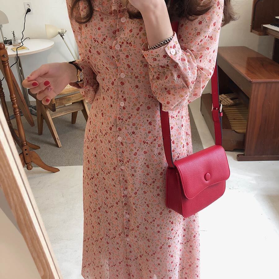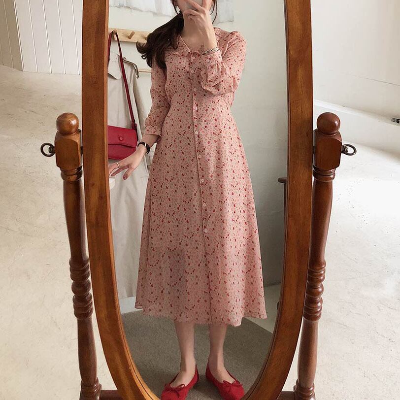 全2色 花柄 シフォンワンピース フリル襟 フレア Vネック フロントボタン バックリボン ハイウエスト Aライン 長袖 ワンピ ミモレ丈 可愛い 大人可愛い レディース ガーリー レトロ フェミニン キュート 清楚 上品 お出かけ 通勤 買い物 デート 女子会 春
