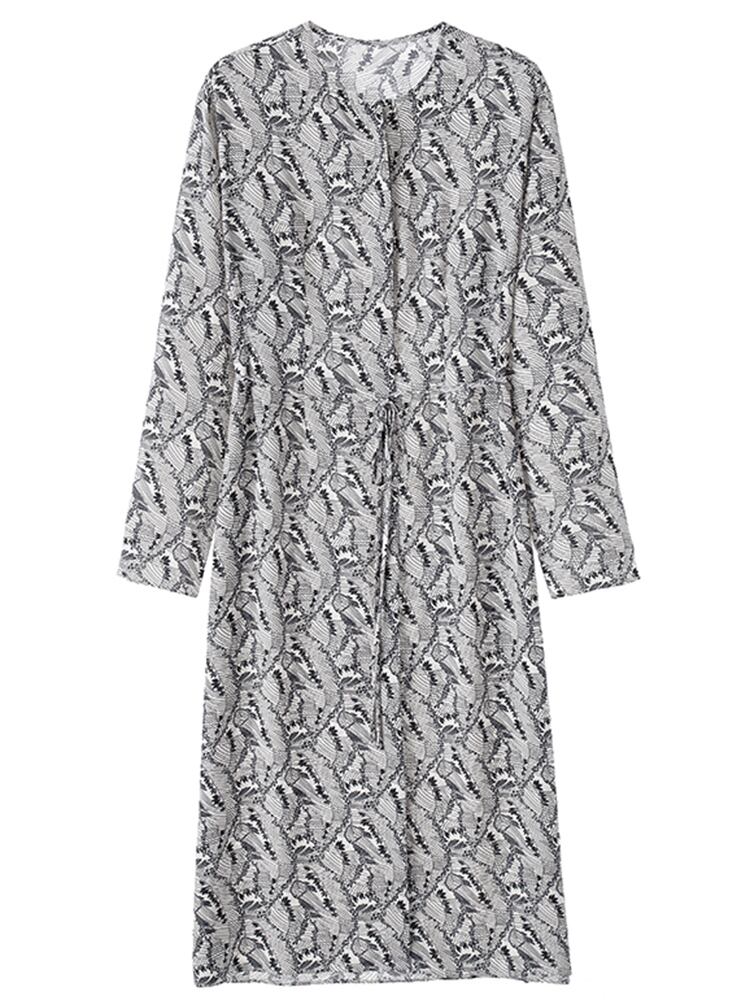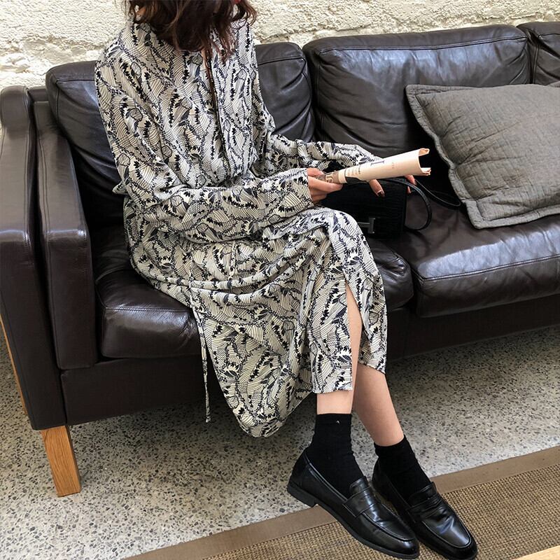 花柄 ワンピース ロング丈 長袖 ロングスリーブ Vネック モノトーン スリット ボタニカル柄 カジュアル デイリー オフィス 大人 上品 紐 リボン 春 秋 大きいサイズ プラスサイズ