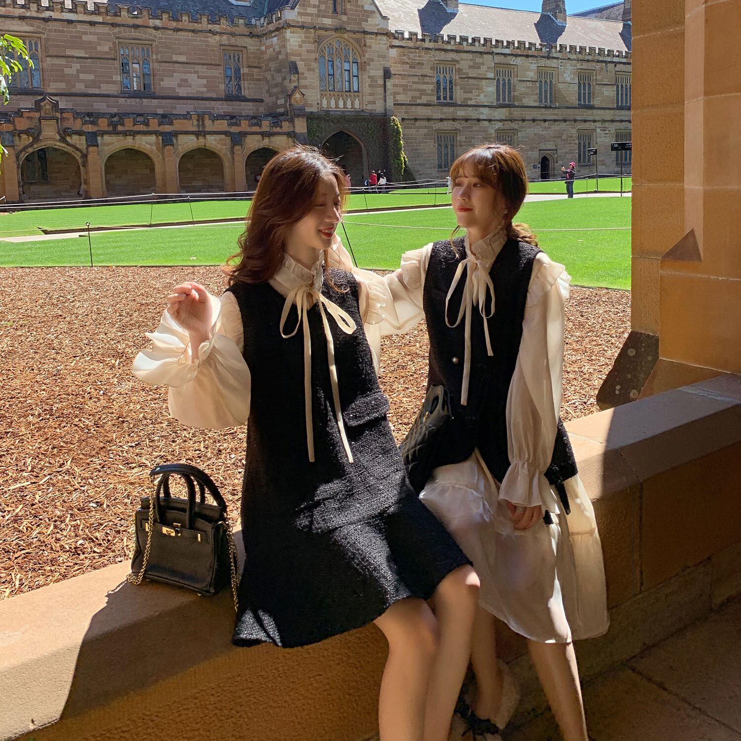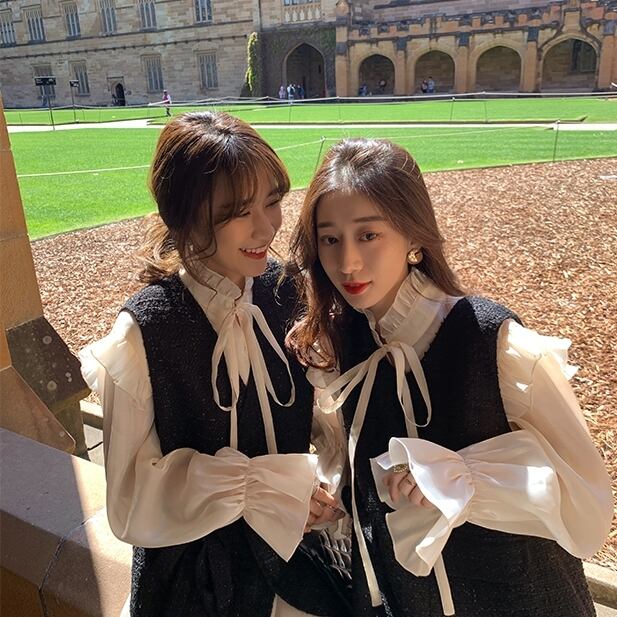 全2種 ワンピース ブラウス シャツワンピ フリル リボン ツイード 膝上 フェミニン ノースリーブ 長袖 ロングスリーブ ミニ丈 セットアップ ツーピース ベスト モノトーン 春 夏 秋