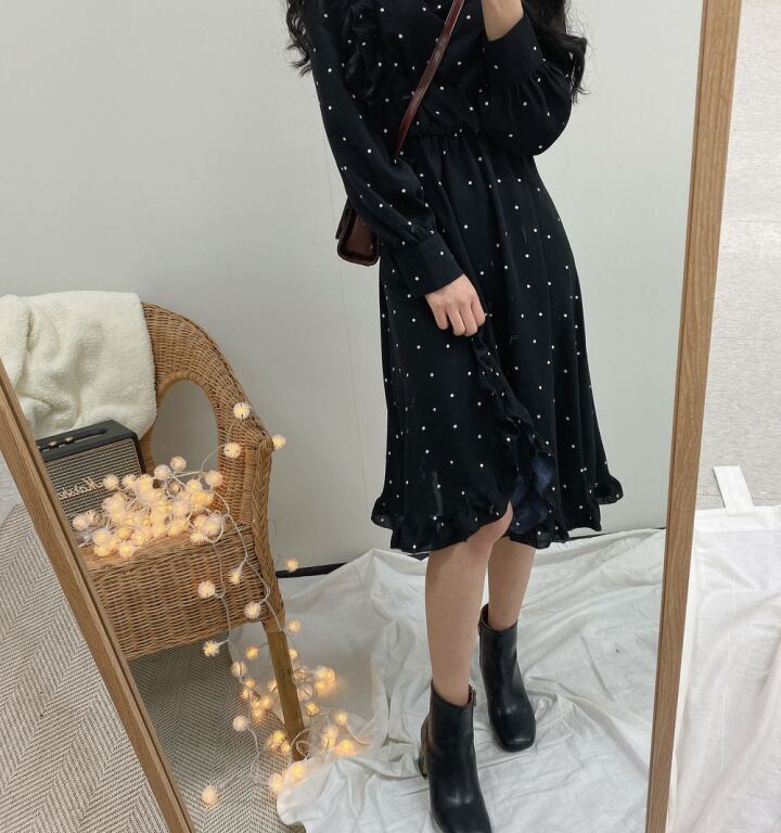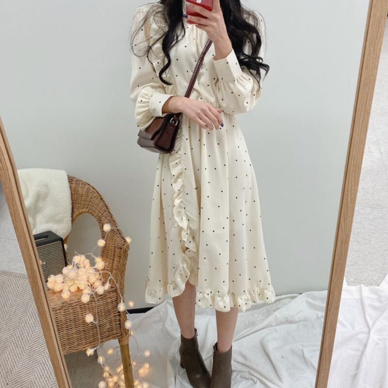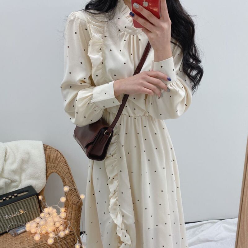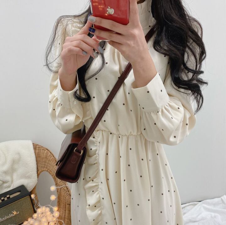 全2色 ドット 水玉柄 ワンピース フリル 長袖 ロングスリーブ ミモレ丈 Aライン ハイネック レトロ カワイイ 上品 大人 カジュアル フェミニン カフス ラップスカート モノトーン 黒 白 春 秋