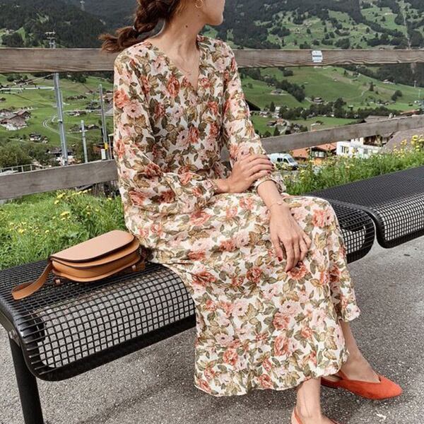 花柄 ワンピース アンティーク 長袖 フラワー柄 ロングスリーブ ロングワンピ フリル Vネック 大人 女子 お出かけ カワイイ 上品 エレガント フレア 春 秋