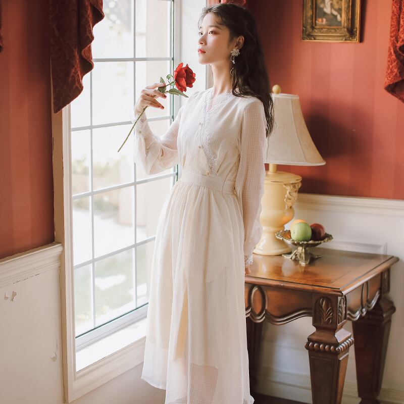 ワンピース 長袖 チェック フリル ロングスリーブ ロングワンピ Vネック レース サーキュラー袖 カフス ハイウエスト シフォン シースルー ボタン 春 夏 秋