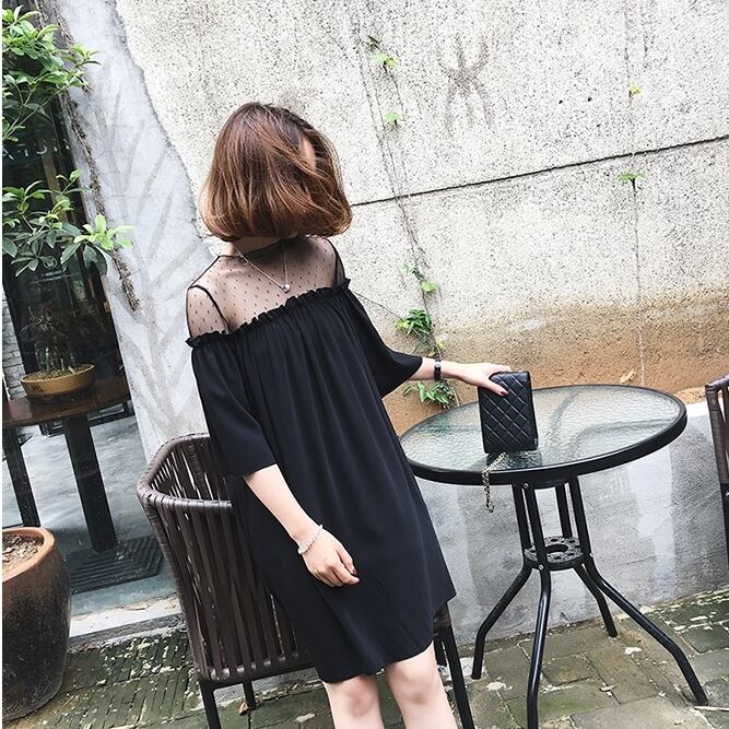 ショルダー部分がドットのシースルーシフォンになっていて、フェイクオフショルのようなデザインのワンピースです。