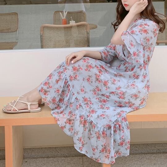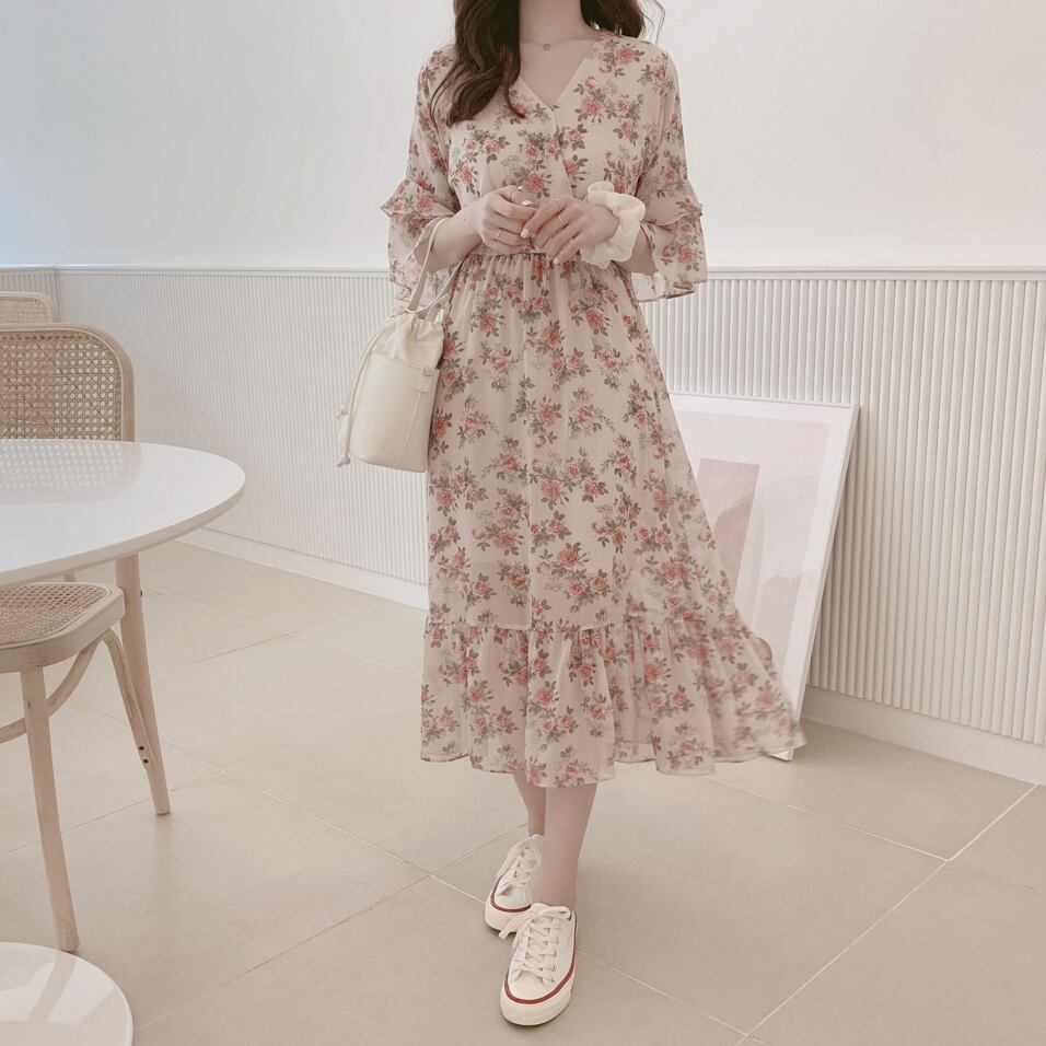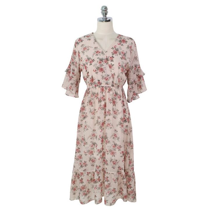 全2色 花柄 ローズ柄 カシュクール ティアードワンピース フレア Vネック 半袖 シフォン フリル袖 ハイウエスト ワンピ ミモレ丈 可愛い 大人可愛い レディース ガーリー レトロ フェミニン お出かけ 買い物 デート 女子会 春