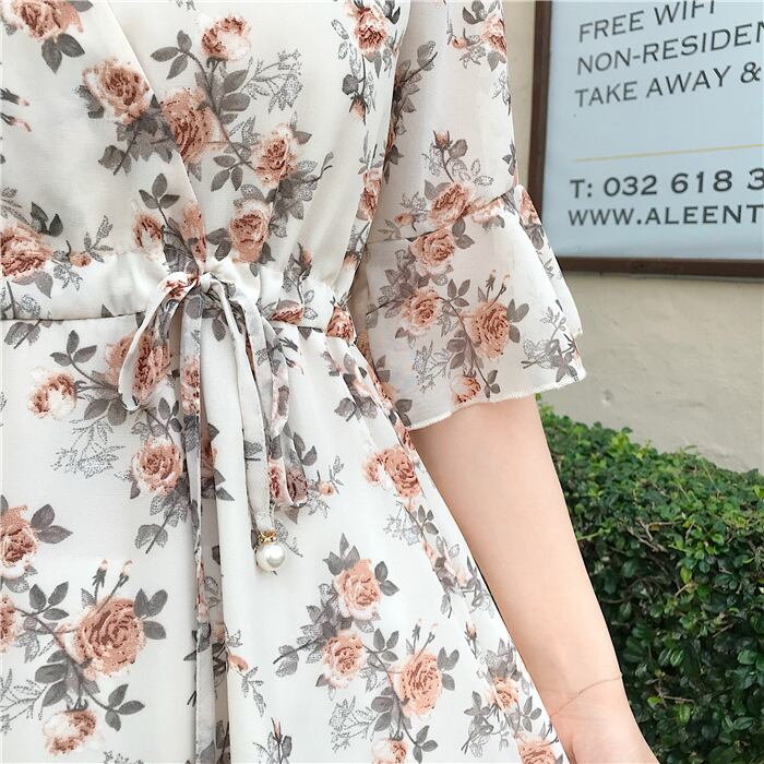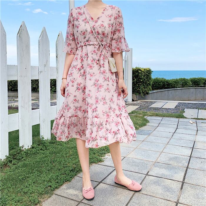 全2色 花柄 ローズ柄 カシュクール ティアードワンピース ウエストマーク フレア Vネック 半袖 7分丈 シフォン フリル袖 ハイウエスト ワンピ ひざ丈 可愛い 大人可愛い レディース ガーリー レトロ フェミニン 上品 お出かけ 買い物 デート 女子会 夏