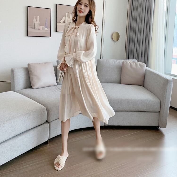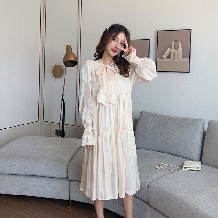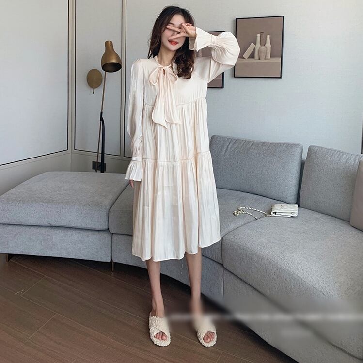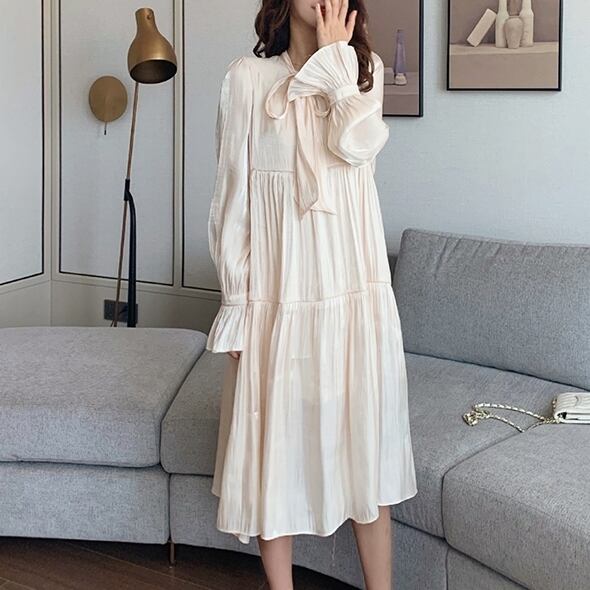 ロングワンピース ロングスリーブ ワンピース 無地 リボン トランペットスリーブ ハンドカフス フリル フレア Aライン 白 ホワイト ティアード シンプル 春 秋
