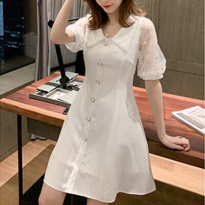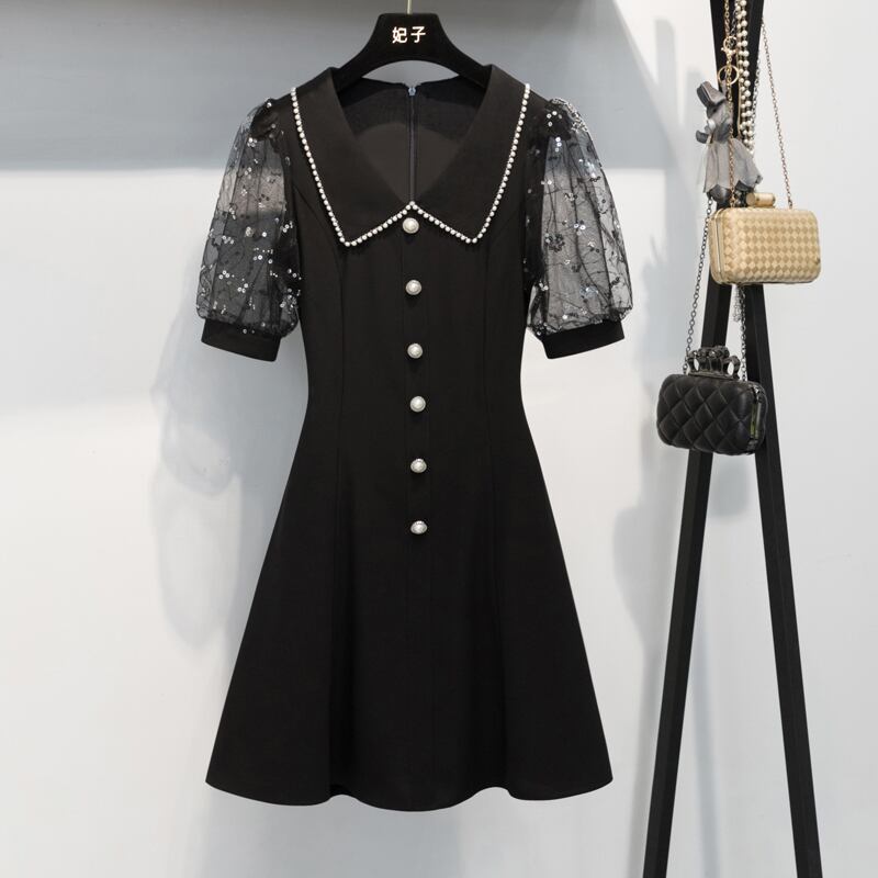 全2色 シースルー パール襟 ワンピース スパンコール フロントボタン Vネック ショート丈 ミニ丈 半袖 ハイウエスト Aライン 大人可愛い カジュアル フェミニン フォーマル レトロ キュート 清楚 上品 パーティー お呼ばれ 女子会 大きいサイズ 夏