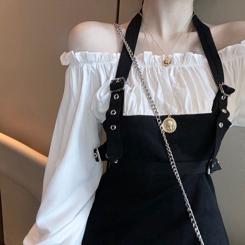 長さ調節が可能な肩ひもはクールなベルトデザイン!大胆なオフショルデザインはフリルで甘さをプラスして