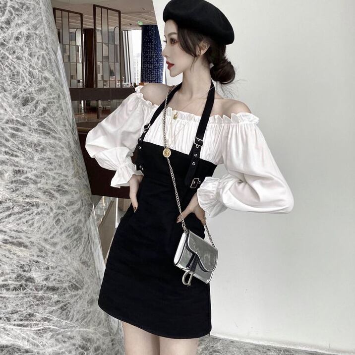 フェイクワンピース ドッキングワンピース オフショル ブラウス ミニ丈 ショート丈 長袖 半袖 ハイウエスト ジャンパースカート ワンピ 大人可愛い カジュアル フェミニン ロック クール ガーリー キュート デート 春