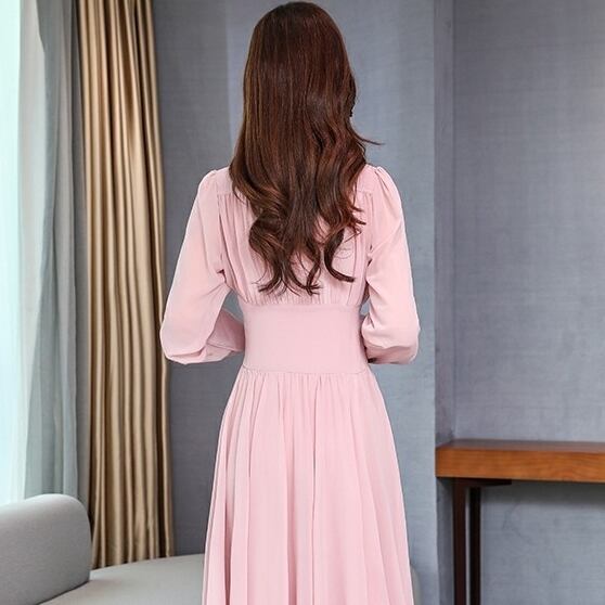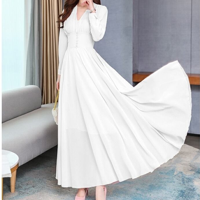 全5色 ロング ワンピース ドレス 無地 長袖 ロングスリーブ フレア ウエストシェイプ Vネック シンプル ボタン Aライン タイト タック エレガント 大人 かわいい キャバ嬢 パーティードレス 大きいサイズ プラスサイズ 春 秋