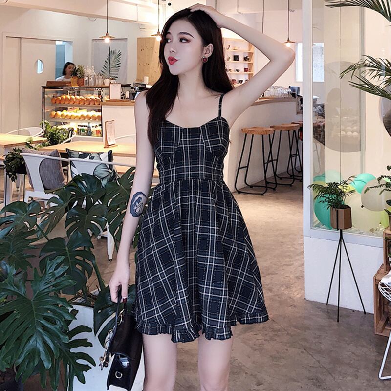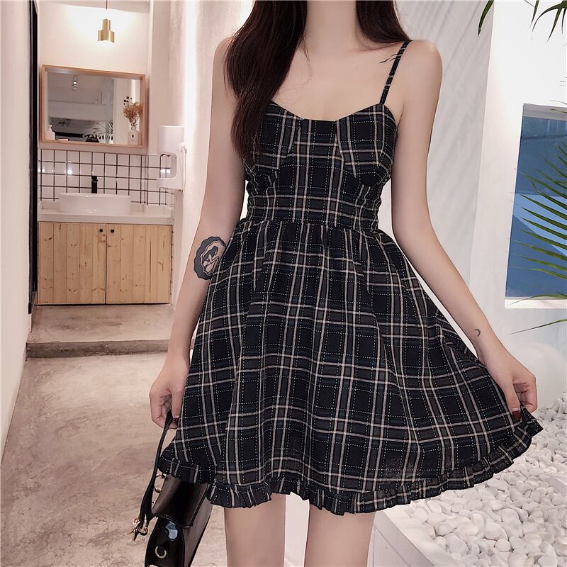 チェック スリング キャミソール ワンピース フレア 膝上 ミニワンピ 肩紐 タータンチェック Aライン ウエストシェイプ フリル 黒 ブラック かわいい フェミニン ガーリー レディース 春 夏