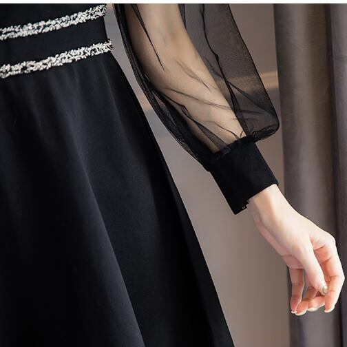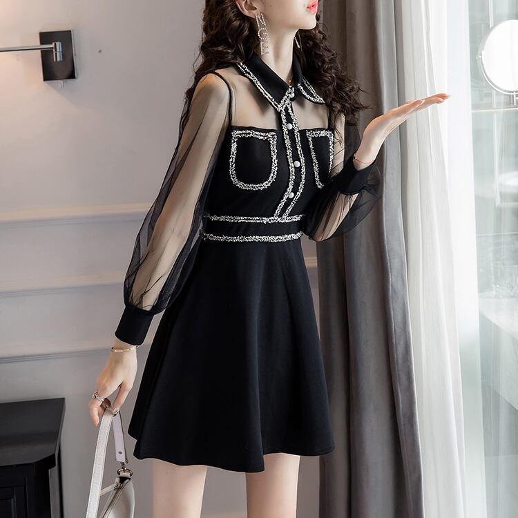ステッチ シースルー 襟付き シフォンワンピース パール フレア フロントボタン ハイウエスト Aライン 長袖 ワンピ ミニ丈 ショート丈 可愛い 大人可愛い レディース シック きれいめ レトロ フェミニン キュート 清楚 上品 パーティ お呼ばれ お出かけ パーティー 買い物 デート 女子会 大きいサイズ 春