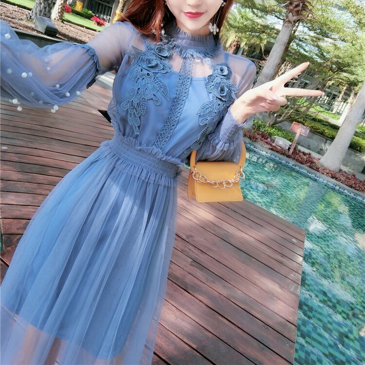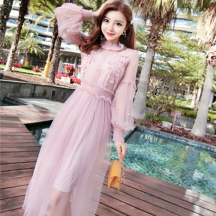 全2色 2点セット 花柄刺繍 チュールワンピース シースルー シフォン フレア ハイネック パール ハイウエスト Aライン ボリューム袖 長袖 ワンピ ロング丈 可愛い 大人可愛い レディース きれいめ ガーリー レトロ フェミニン キュート 清楚 上品 パーティ お呼ばれ お出かけ 通勤 買い物 デート 女子会 春