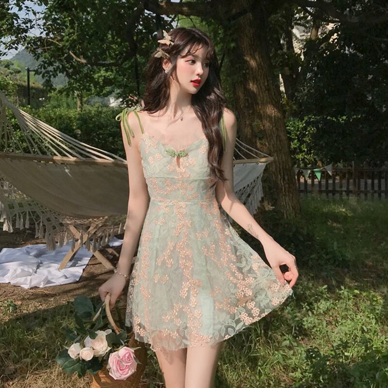 花柄 刺繍 ワンピース ミニワンピ メッシュ シフォン フリル 肩紐 リボン Vネック キャミワンピ フレア ライトグリーン 肩リボン ハイウエスト カワイイ フェアリー 妹コーデ ガーリー クラシカル ファンタジー ロリータ 春 夏