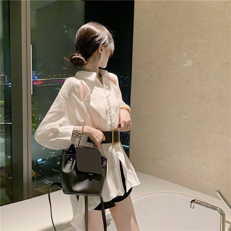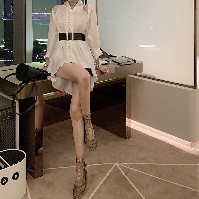オープン ショルダー シャツ ワンピース ブラウス チュニック ミニワンピ ボタン ショルダー デザインシャツ 無地 シンプル 大人 レディース セクシー セレブ風 ベルト付き 安い 白 ホワイト カワイイ 春 夏 秋