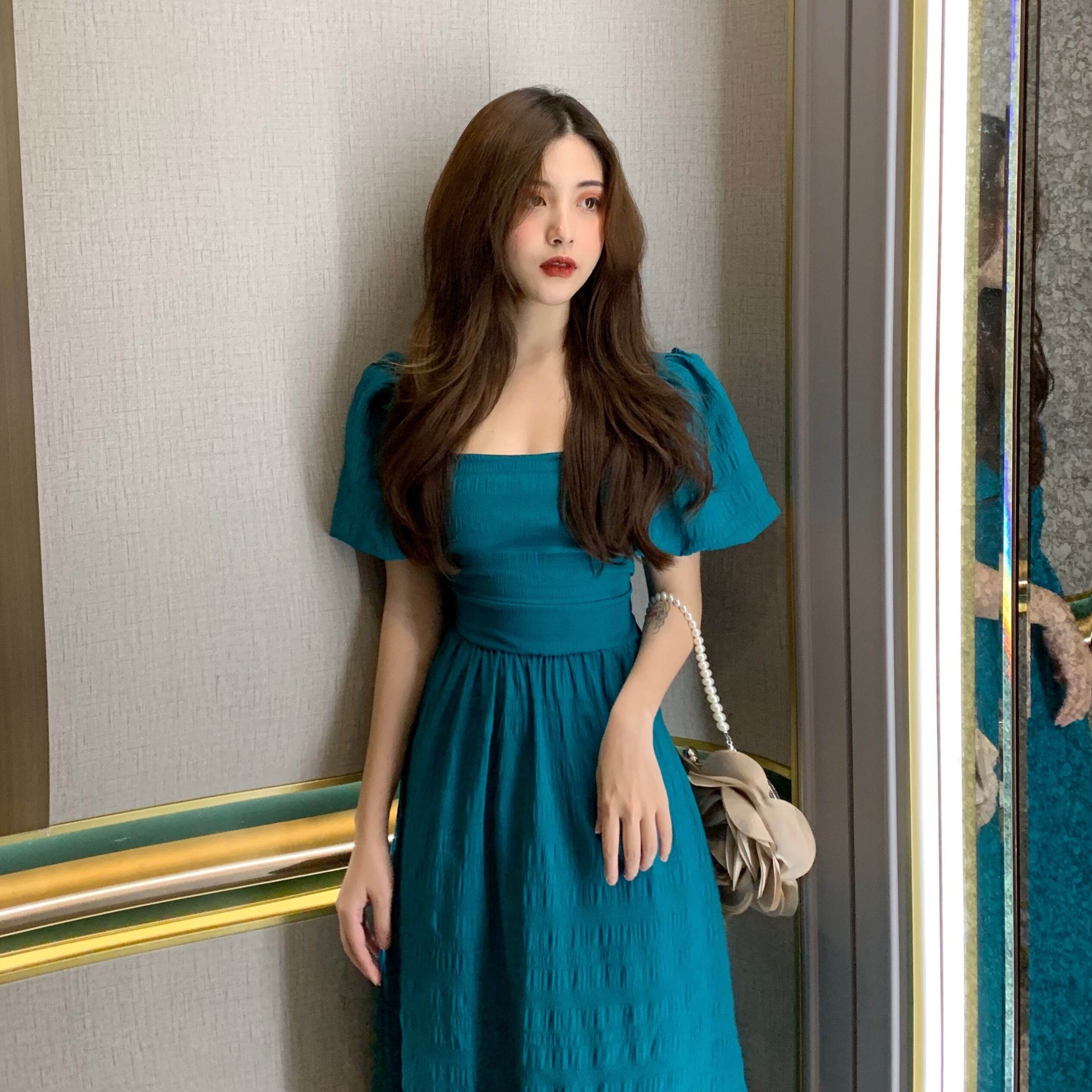 ワンピース 半袖 ミドル丈 ミモレ丈 ワンピ 背中開き スクエアカラー ハイウエスト ゴム 紐リボン Aライン ティアード 青 ブルー 春 夏