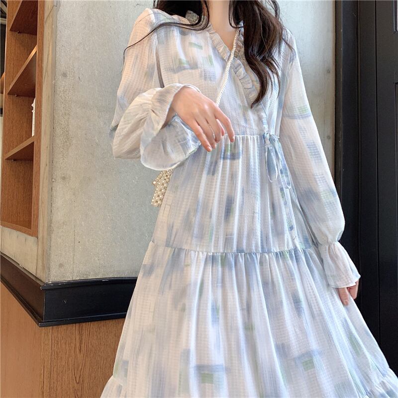 白ベースのブルーの柄がカワイイデザインで、襟、袖にはフリルが施され、ティアードスカートが女性らしい