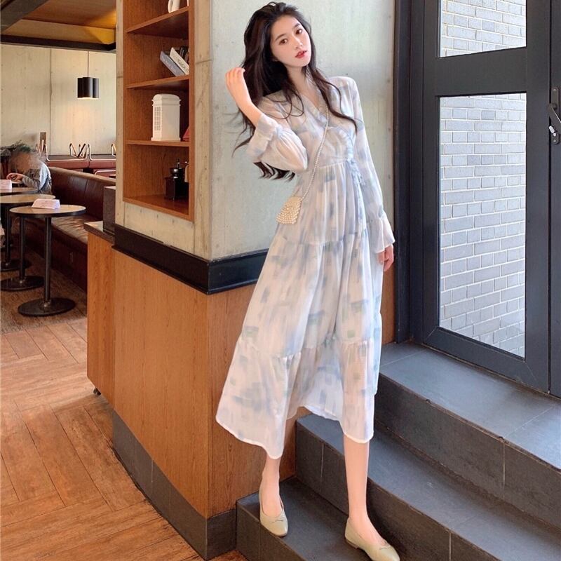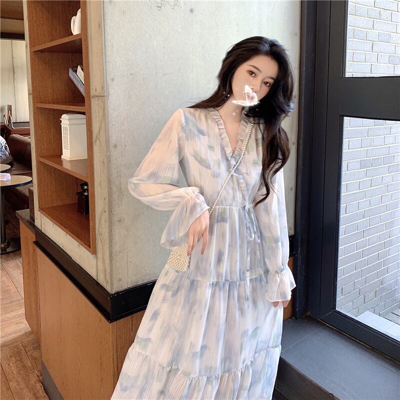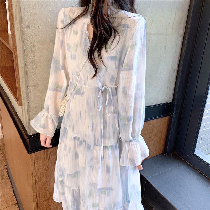 シフォン ミディ丈 ワンピース 長袖 ロングスリーブ タイダイ柄 フレア Aライン フリル ティアード シースルー 白 ブルー 春 夏 秋