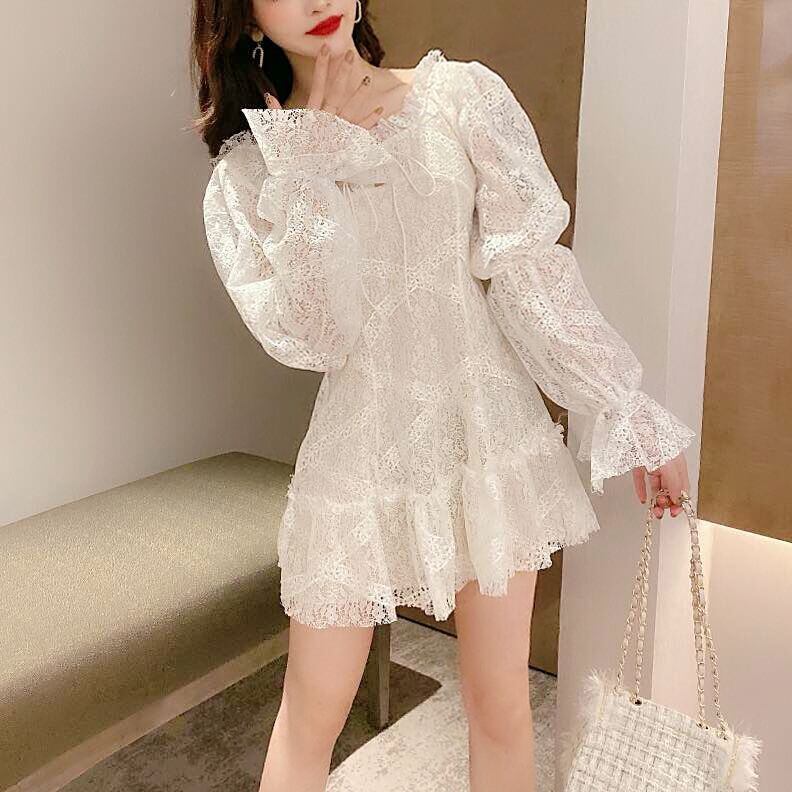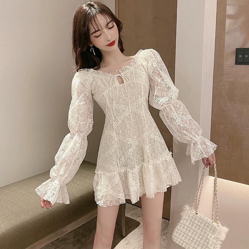 背中の大胆な素肌魅せと白の花柄総レースが女の子らしい甘めワンピース。