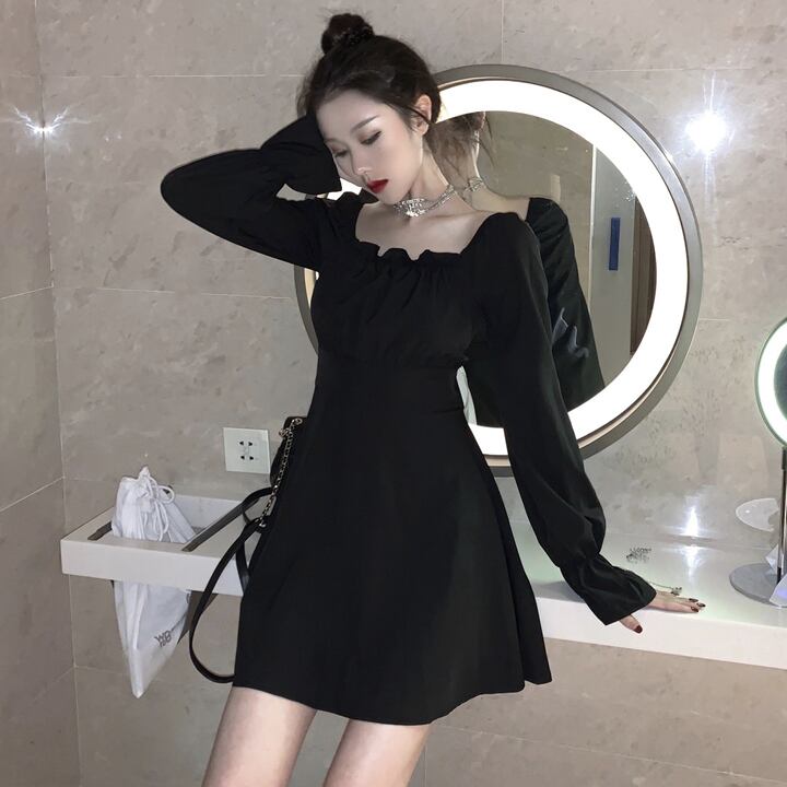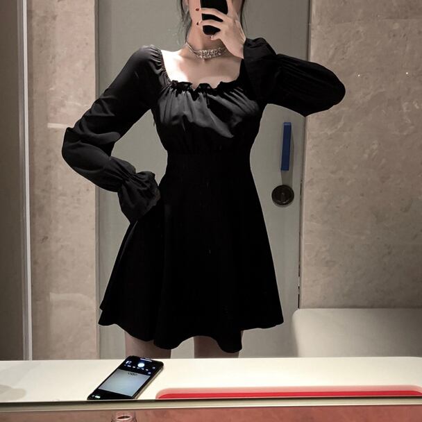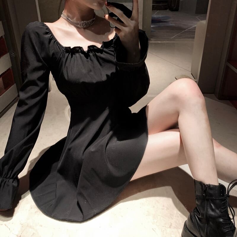 レースアップ 編み上げ リボン ワンピース ハイウエスト スクエアネック 長袖 ボリューム袖 ワンピ ミニ丈 ショート丈 可愛い 大人可愛い レディース フェミニン ガーリー シンプル ゴシック クール お出かけ 買い物 デート 女子会 春
