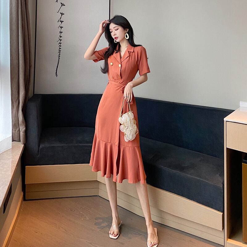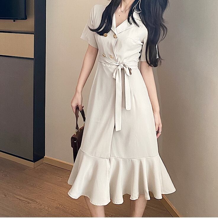 全3色 ミモレ丈 ワンピース 半袖 ダブルボタン コートデザイン フリル ウエスト リボン Vネック 無地 シンプル 大人 レディース カワイイ 上品 エレガント 春 夏 秋