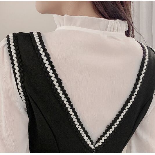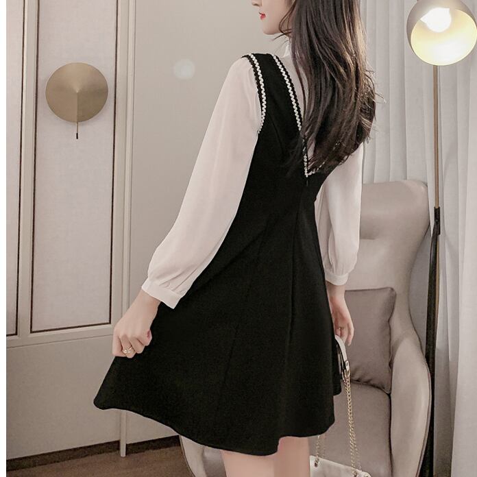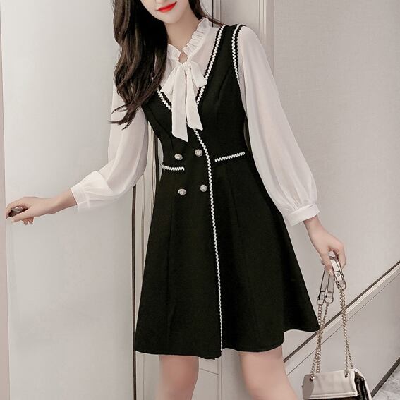 2点セット ボウタイブラウス ワンピース ジャンパースカート トレンチデザイン ボウタイ ブラウス Aライン Vネック パイピング 長袖 ボリューム袖 ベルスリーブ 袖フリル ワンピ ひざ丈 可愛い 大人可愛い レディース ガーリー レトロ フェミニン きれいめ お出かけ 通勤 買い物 デート 女子会 大きいサイズ 春