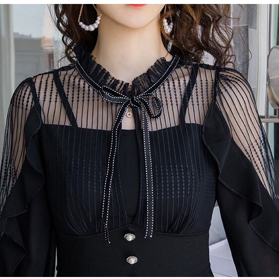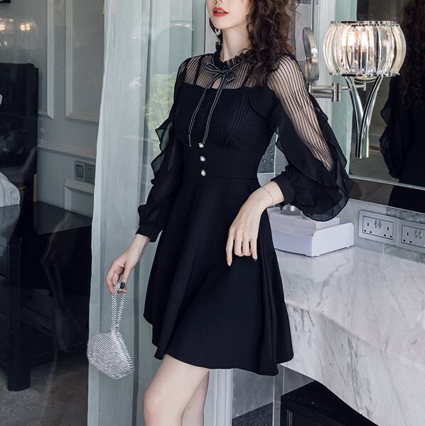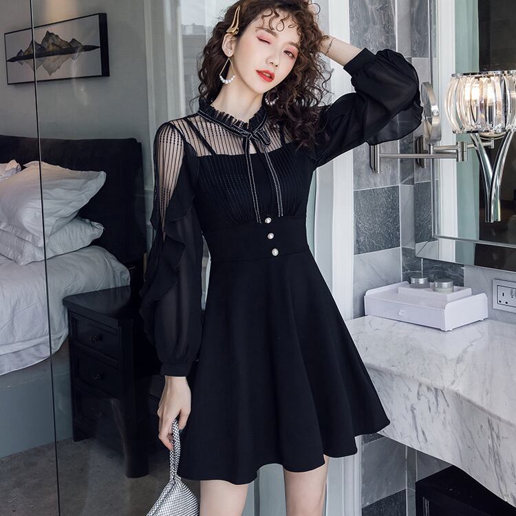 ボウタイ シースルー 切り替え ワンピース シフォン フリル襟 フレア ラッフルフリル ハイウエスト Aライン 長袖 ワンピ ショート丈 ミニ丈 可愛い 大人可愛い レディース ガーリー レトロ フェミニン キュート フォーマル 上品 お出かけ パーティー デート 女子会 大きいサイズ 春