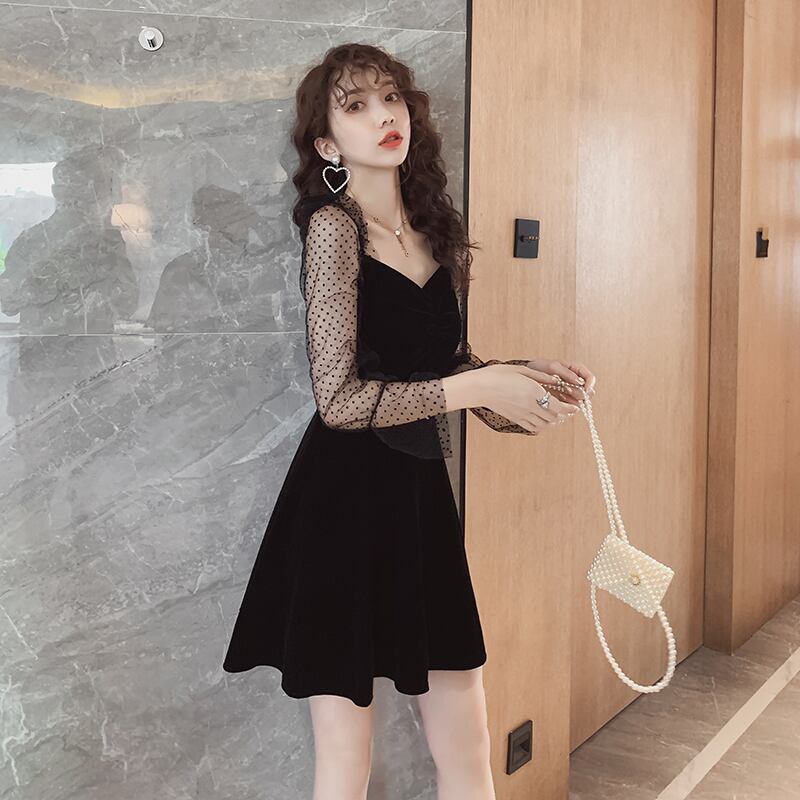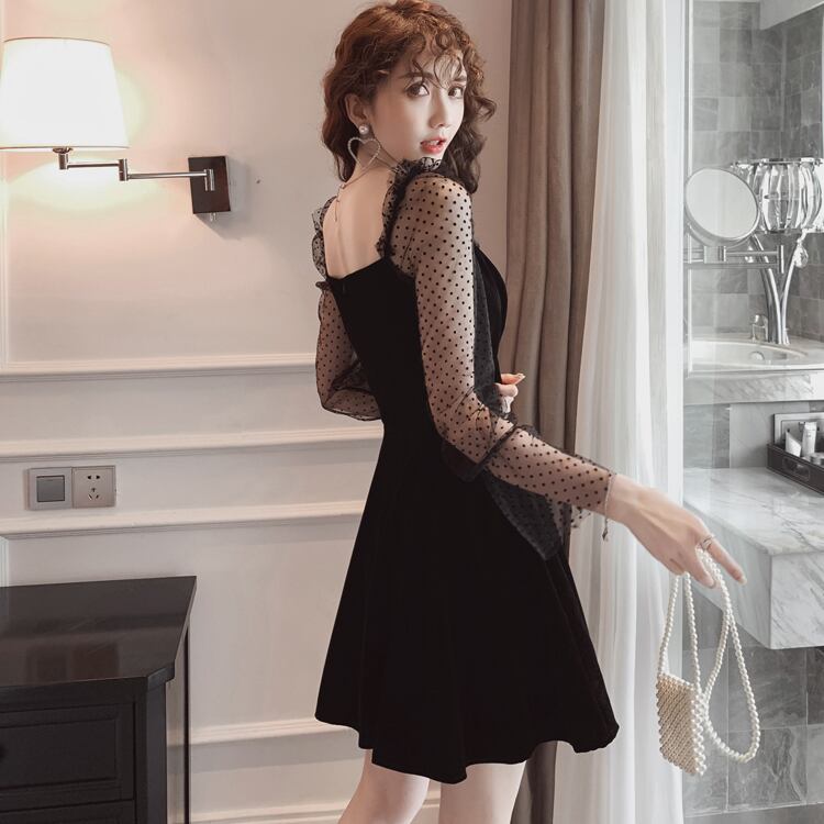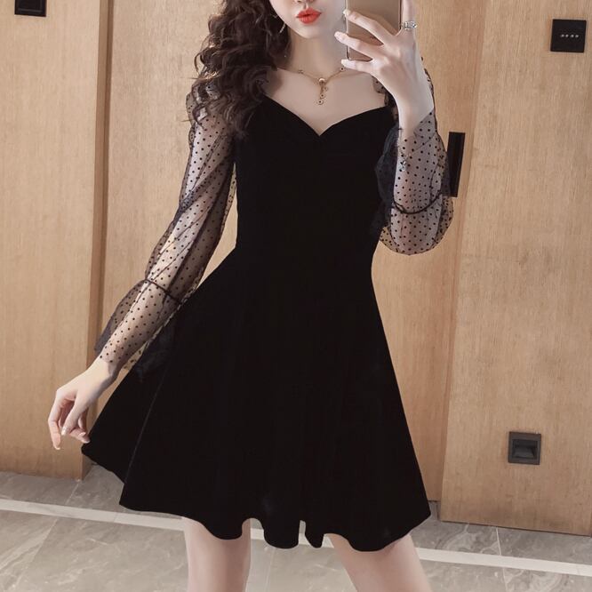 ドット 水玉 ベロア ベルベット シースルー 切り替え ワンピース 胸元ギャザー シフォン フレア Vネック ハイウエスト Aライン 長袖 キャンディスリーブ ワンピ ショート丈 ミニ丈 可愛い 大人可愛い レディース ガーリー レトロ エレガント フェミニン キュート フォーマル 上品 お出かけ パーティー デート 女子会 大きいサイズ 春