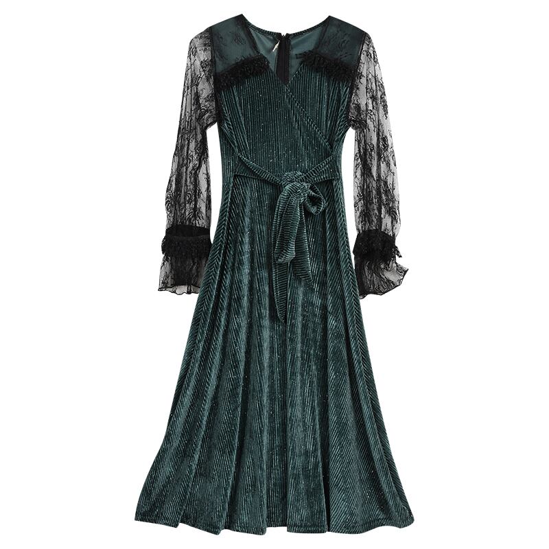 シースルー カシュクール ベルベット ワンピース Vネック ハイウエスト ウエストリボン Aライン 長袖 キャンディスリーブ ワンピ ミモレ丈 可愛い 大人可愛い レディース ガーリー レトロ エレガント フェミニン キュート フォーマル 上品 お出かけ パーティー デート 女子会 春