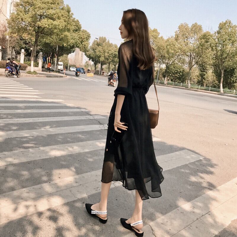 全2色 シフォン ワンピース シースルー ハイウエスト ウエストマーク Aライン ラウンドネック 長袖 ワンピ ミモレ丈 可愛い 大人可愛い フレンチスタイル きれいめ レディース フェミニン 清楚 上品 通勤 女子会 お呼ばれ 大きいサイズ 春