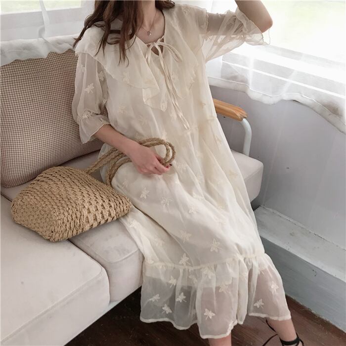 ネットヤーン ワンピース 5分袖 刺繍 フリル ガーリー フレア Aライン リボン Vネック ロング丈 ゆるカワ 森ガール ナチュラル アプリコット ゆったりめ 春 夏 秋 バタフライ柄