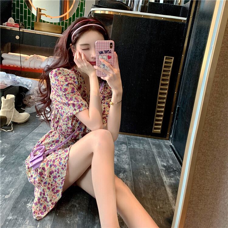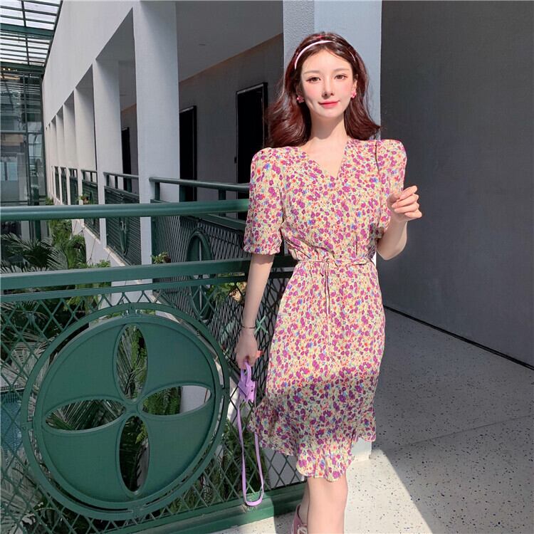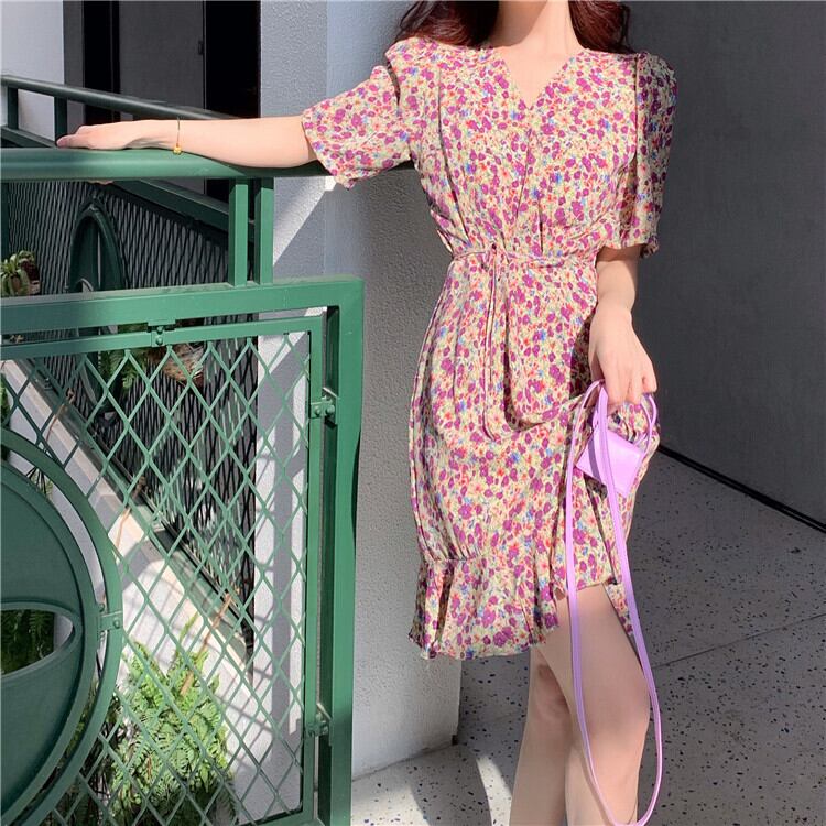 花柄 ワンピース 半袖 膝上 フリル Vネック ガーリー カシュクール フレア ウエストシェイプ フローラル 小花柄 フラワー かわいい 春 夏 ガーリー