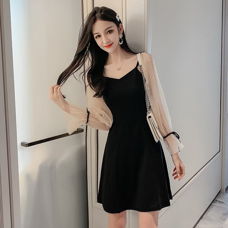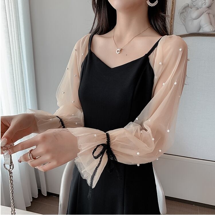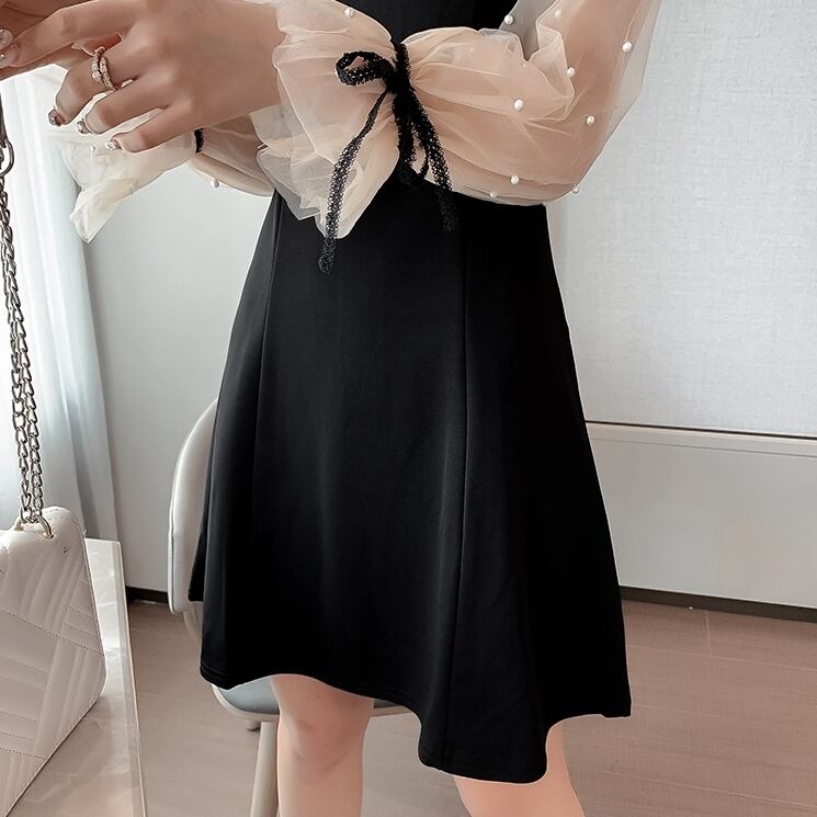 シースルー シフォン 切り替え ワンピース ミニワンピ Aライン リボン ランタンスリーブ 長袖 ロングスリーブ パール お呼ばれ デート お出かけ 旅行 二次会 パーティー 妹コーデ カワイイ 大きめサイズ