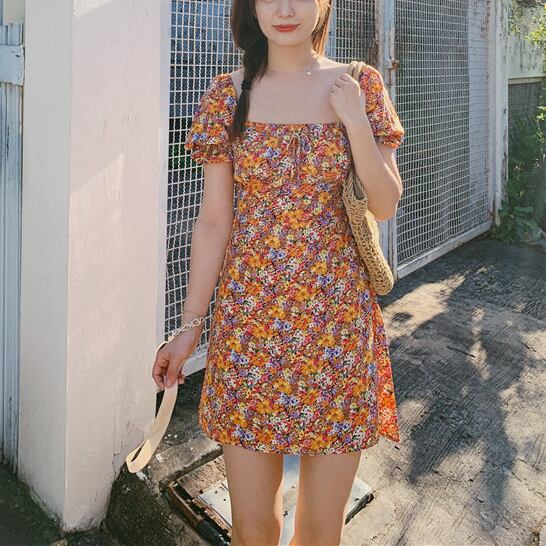 花柄 ワンピース 胸元ギャザー フレア スクエアネック ハイウエスト リボン Aライン 半袖 パフスリーブ ワンピ ミニ丈 ショート丈 可愛い 大人可愛い レディース ガーリー レトロ フェミニン キュート お出かけ 通勤 買い物 デート 女子会 小さいサイズ 大きいサイズ 夏