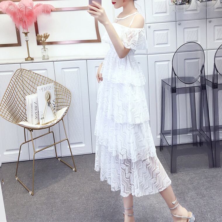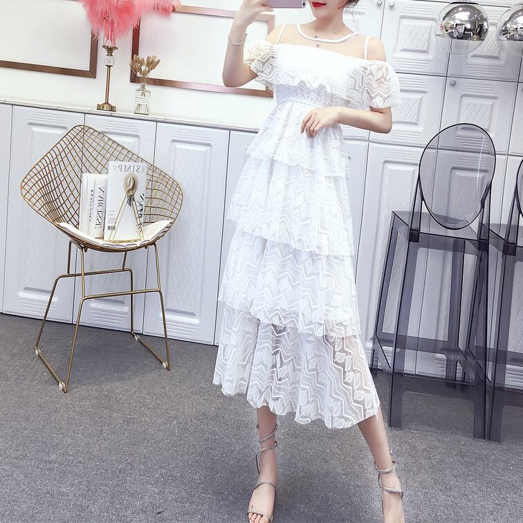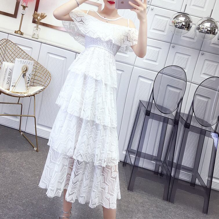 全2色 リーフ柄 レースワンピース オープンショルダー シースルー 透け感 ハイウエスト 4段フリル Aライン ワンピ ミモレ丈 可愛い 大人可愛い レディース セクシー フェミニン キュート エレガント 上品 お出かけ パーティー デート 女子会 夏