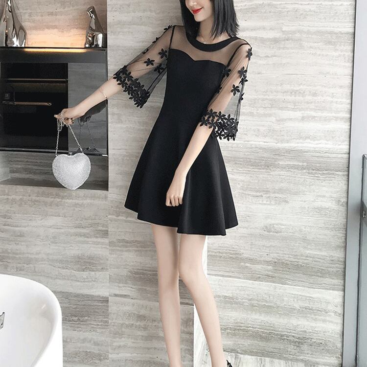 花柄 刺繍 シースルー 切り替え ドッキング ワンピース シフォン フレア ラウンドネック Vネック ハイウエスト Aライン 七分袖 ワンピ ショート丈 ミニ丈 可愛い 大人可愛い レディース ガーリー レトロ フェミニン キュート フォーマル 上品 お出かけ 通勤 パーティー デート 女子会 夏