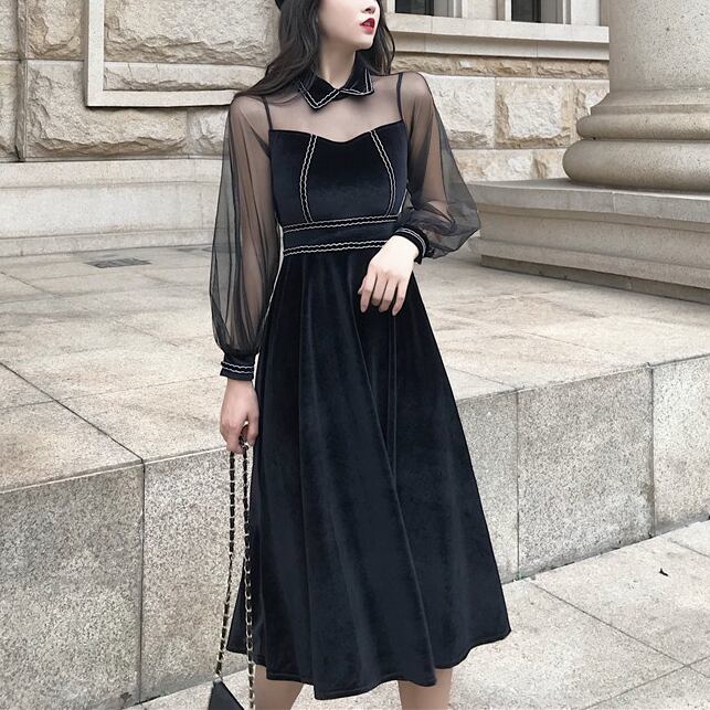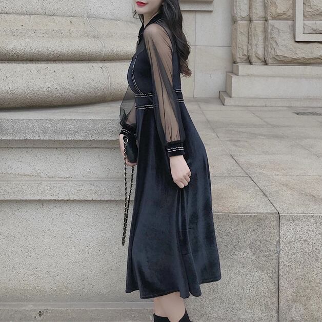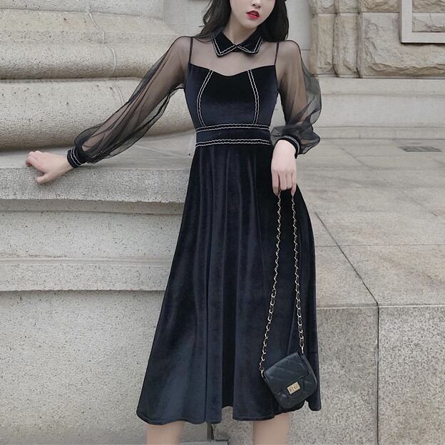 シースルー ステッチ ベルベット ワンピース 襟付き ハイウエスト Aライン 長袖 ワンピ ミモレ丈 可愛い 大人可愛い レディース ガーリー レトロ フェミニン キュート セクシー 清楚 上品 お出かけ 通勤 買い物 デート 女子会 春