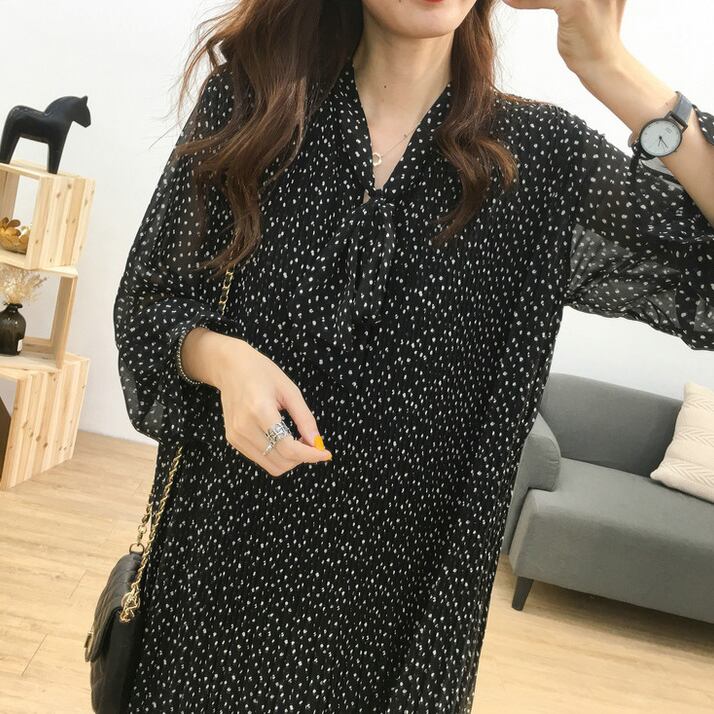 全2色 ドット 水玉 プリーツ シフォンワンピース ボウタイ フレア Vネック Aライン 長袖 キャンディスリーブ ワンピ ミモレ丈 可愛い 大人可愛い レディース ガーリー レトロ フェミニン キュート 上品 お出かけ 通勤 買い物 デート 女子会 大きいサイズ 春