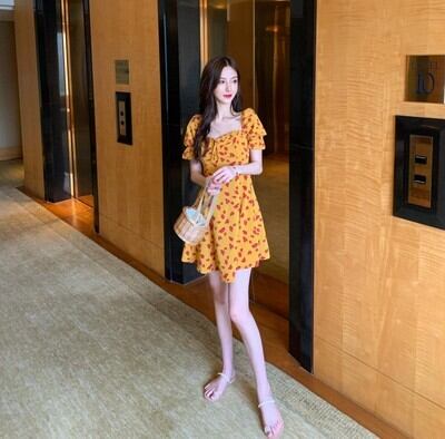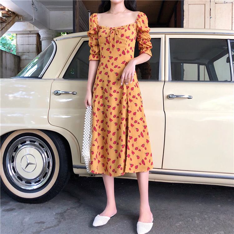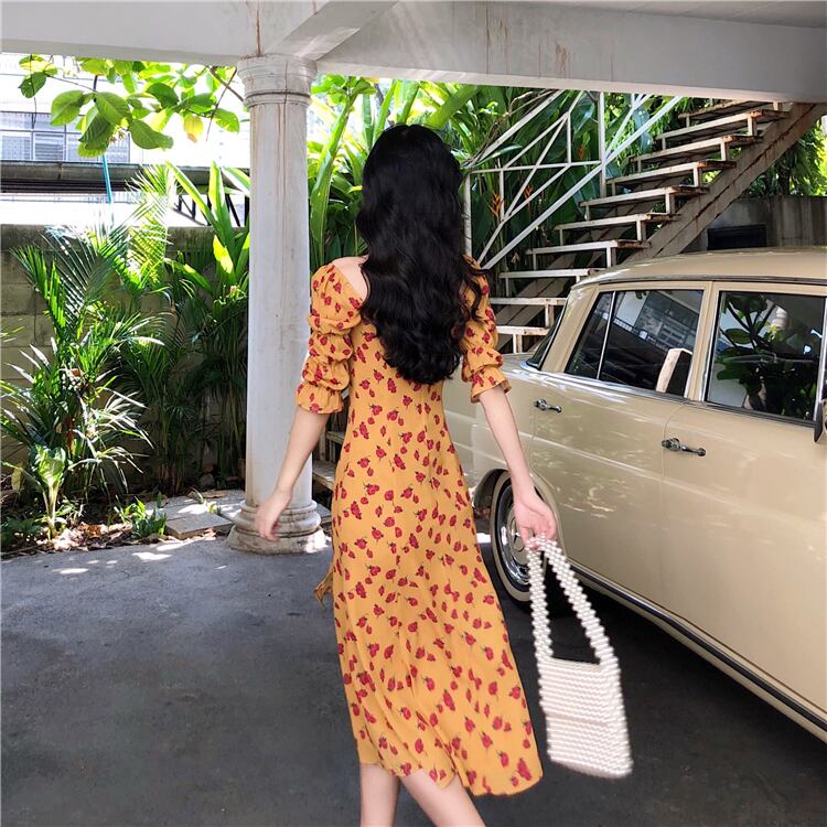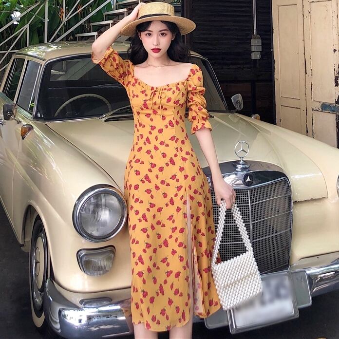 全2種 花柄 ワンピース スクエアネック イエロー スリット バルーンショルダー リボン 膝上 ミモレ丈 エレガント ガーリー フレア Aライン 旅行 お出かけ デート リゾート 女子会 レトロ カワイイ 春 夏 秋
