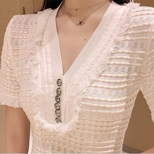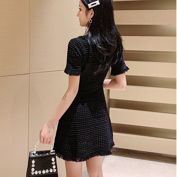 全2色 レース ワンピース 半袖 フレア ミニワンピ ボタン Vネック フリンジ タッセル フリル 上品 レディース 大人 ガーリー 姫系 キャバ嬢 妹コーデ カワイイ エレガント 春 夏 秋