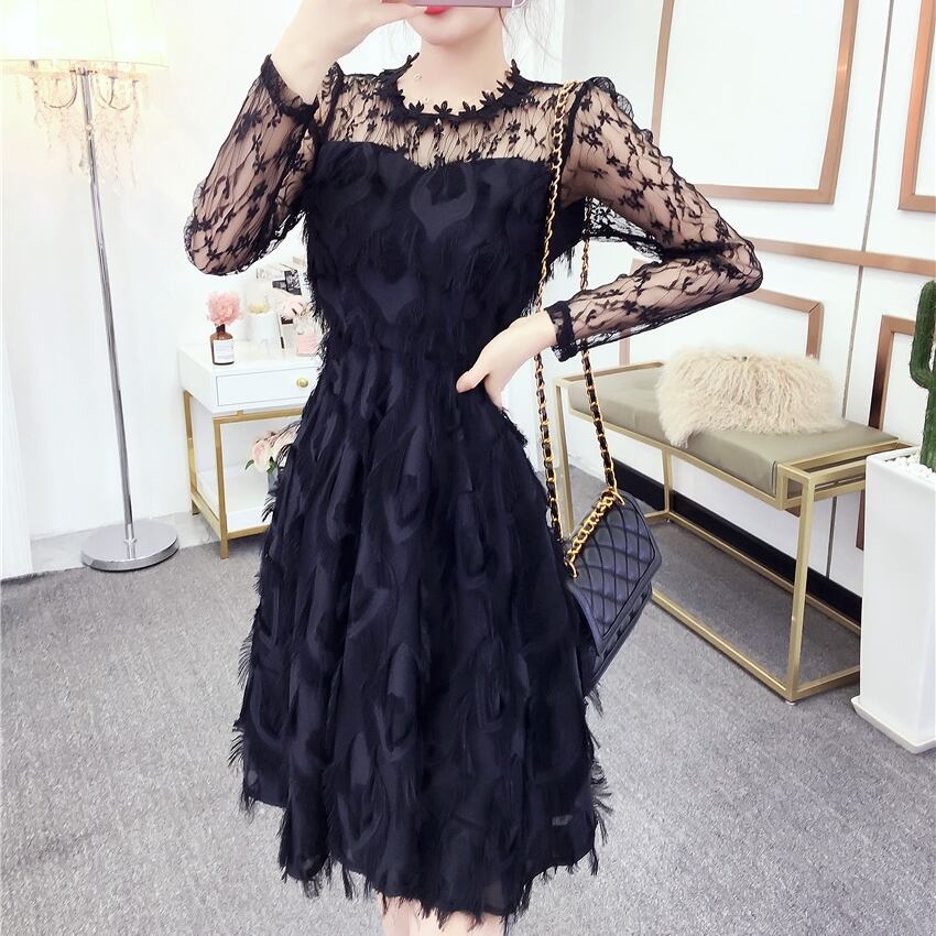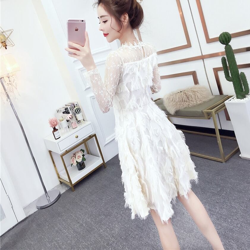 全3色 花柄 レース フェザー タッセル フリンジ ワンピース ミニワンピ 膝上 Aライン 長袖 ロングスリーブ シースルー カワイイ フェミニン キャバ嬢 パーティー 二次会 ナイトドレス 妹コーデ 無地 シンプル 春 夏 秋