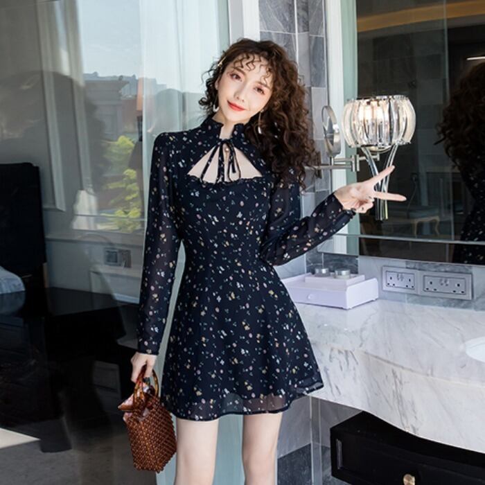 花柄 ワンピース 小花柄 フラワー リボン ハイウエスト 膝上 チャイナドレス風 オープンバスト フリル リボン シフォン 長袖 ロングスリーブ 黒 ブラック ガーリー カワイイ 春 夏 秋