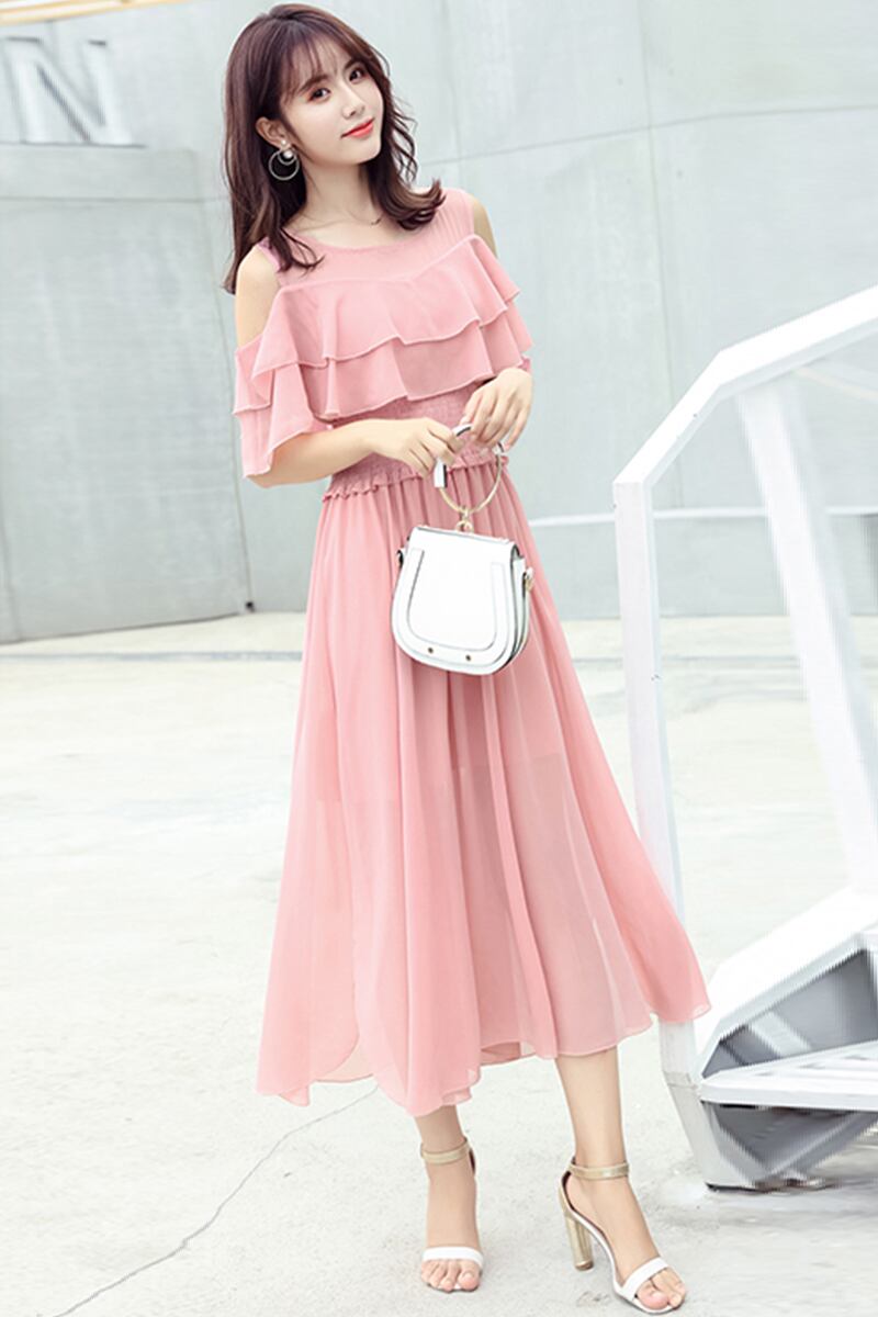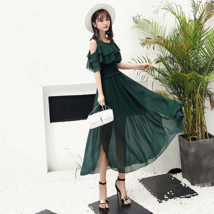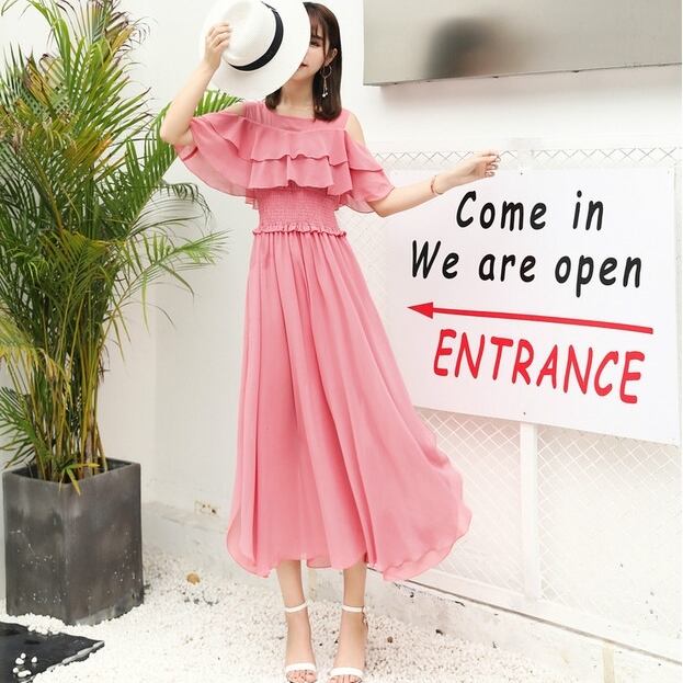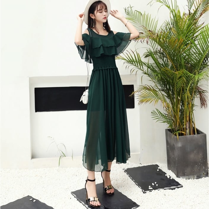 全7色 シフォン ワンピース フリル ロング丈 オープンショルダー フレア Aライン ウエストシェイプ シンプル 無地 ティアード ワンピ 上品 エレガント 旅行 リゾート 春 夏