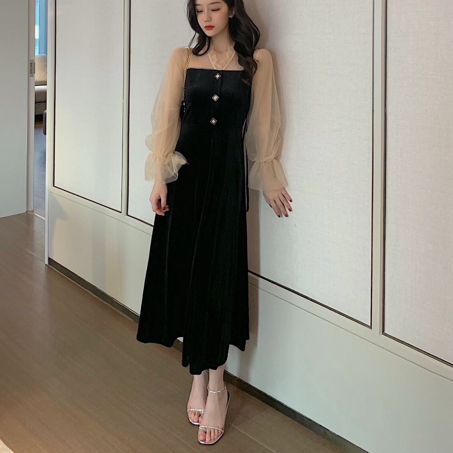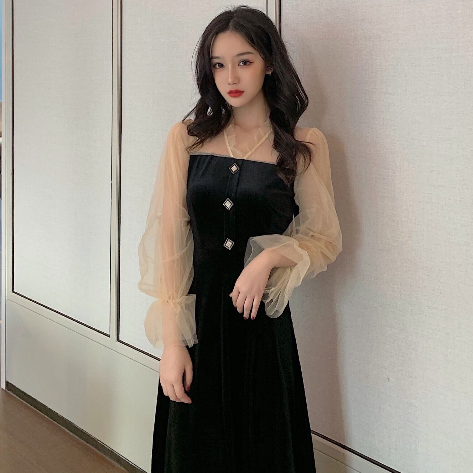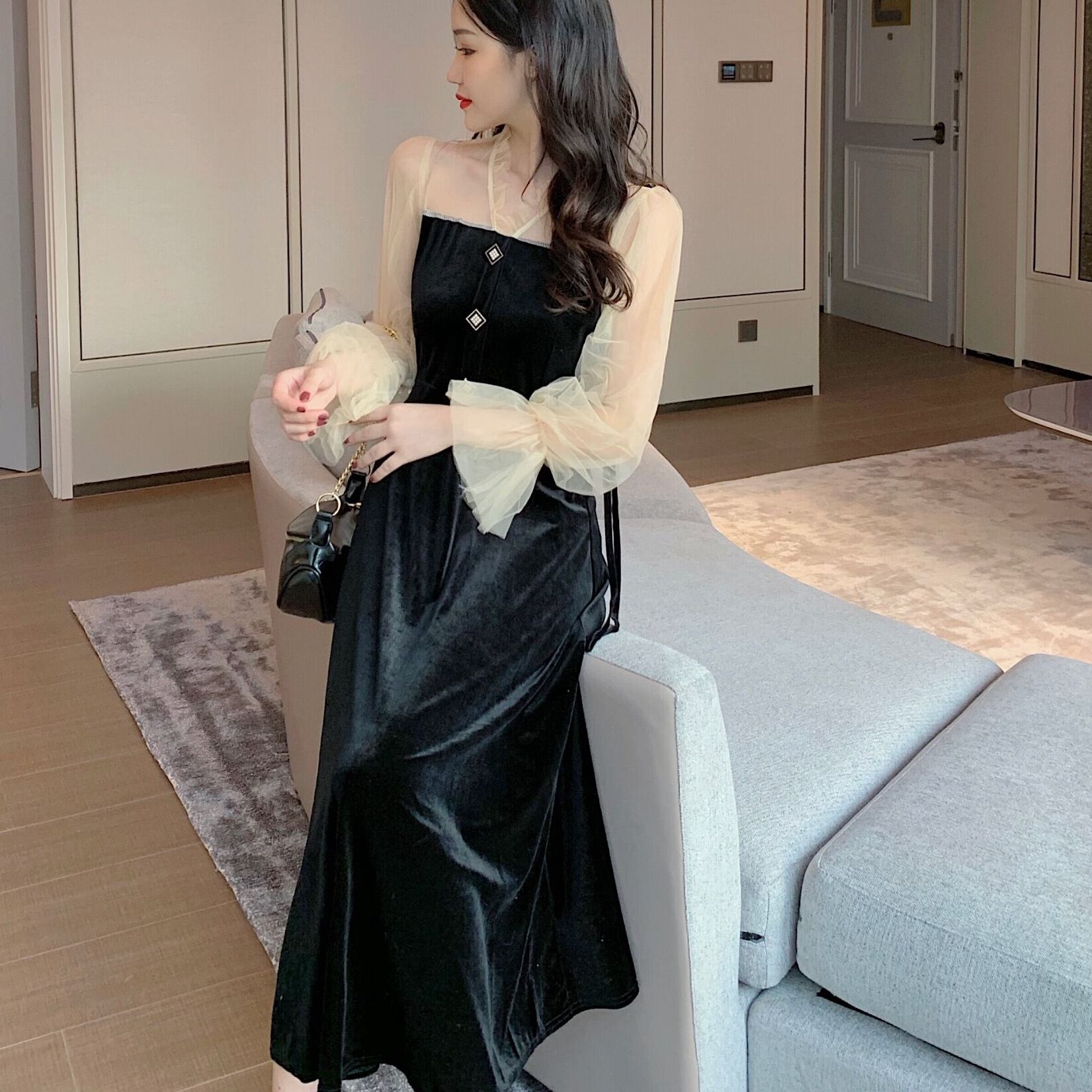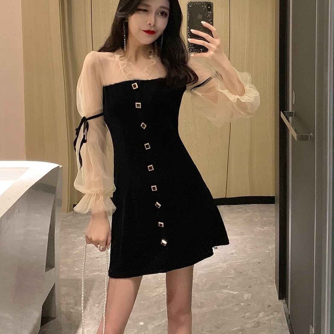 全2種 シフォン ワンピース 切り替え ミニワンピ ロングワンピ 膝上 長袖 ロングスリーブ フリル リボン ボタン シースルー Vネック 春 秋