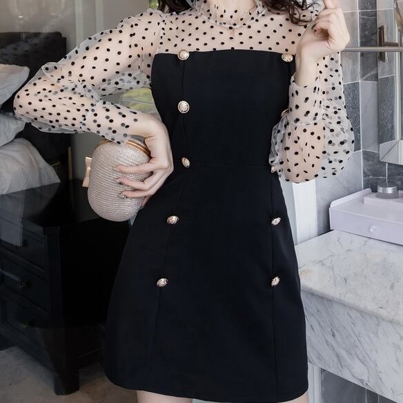 ドット柄 ワンピース シフォン ロングスリーブ シースルー 切り替え ミニワンピ ボタン フリル タイト ミニワンピ 水玉柄 レトロ 上品 エレガント フレア 春 夏 秋 大きいサイズ 黒 モノトーン