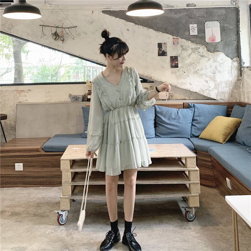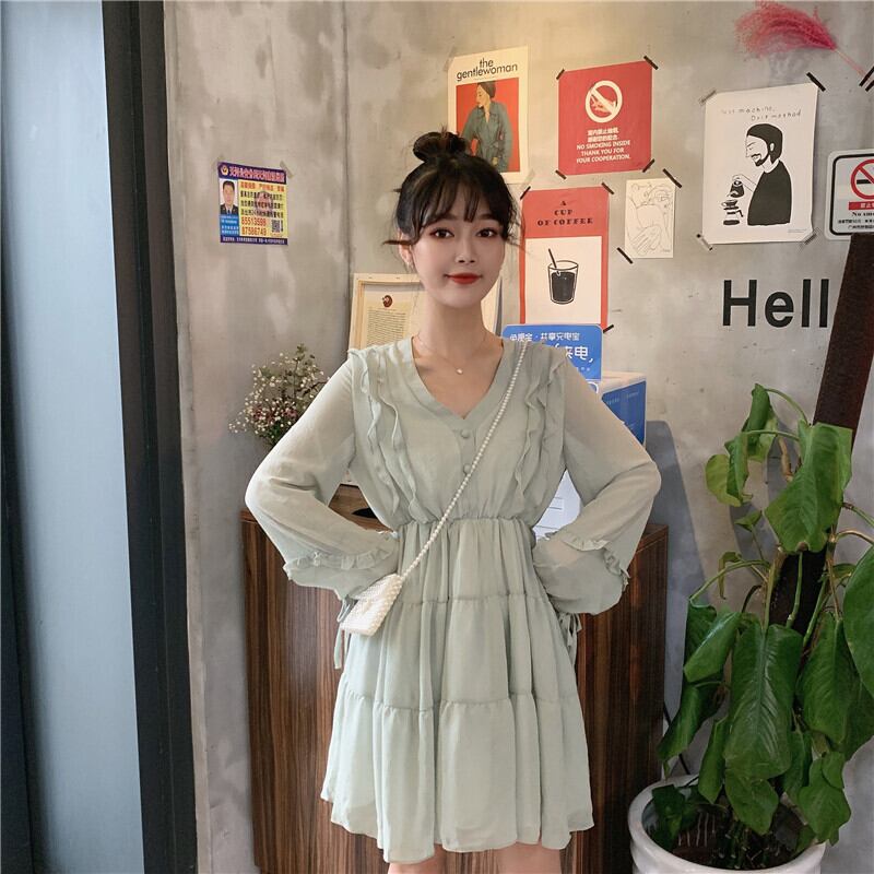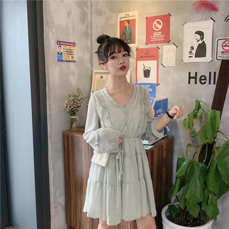 全2色 ワンピース Vネック フリル 長袖 ロングスリーブ フレア 膝上 ミニワンピ ティアード リボン Aライン ボタン シフォン 春 夏 秋
