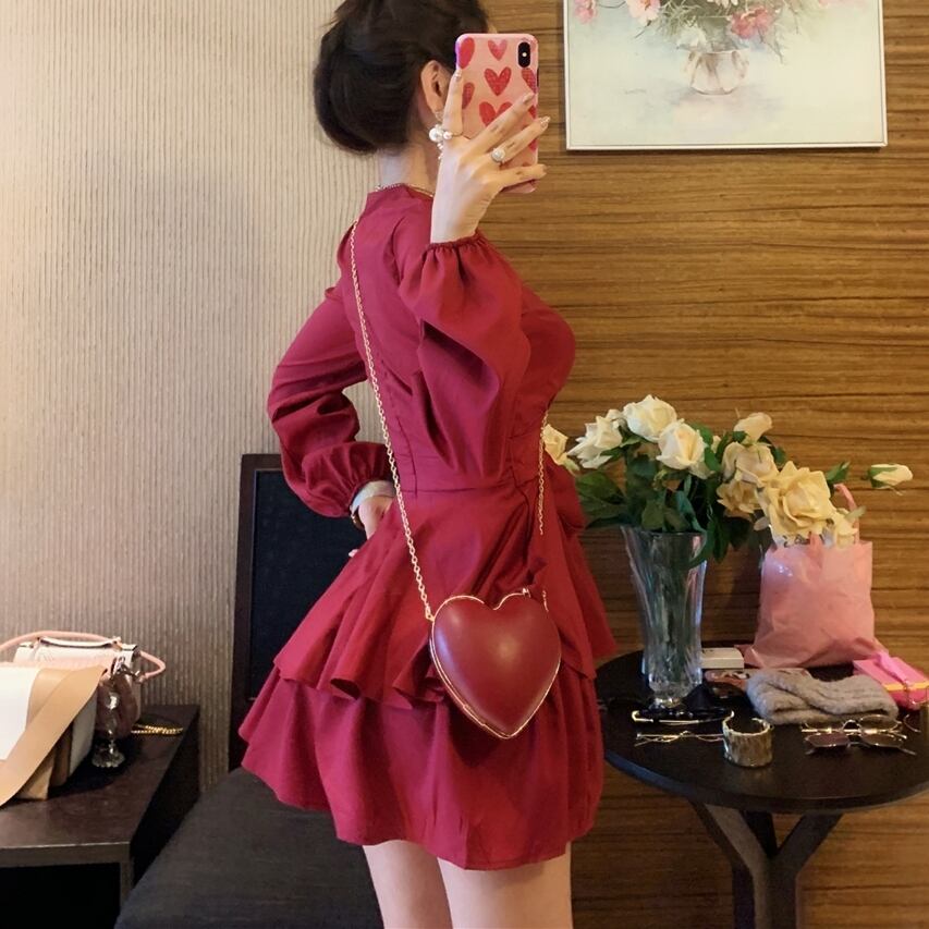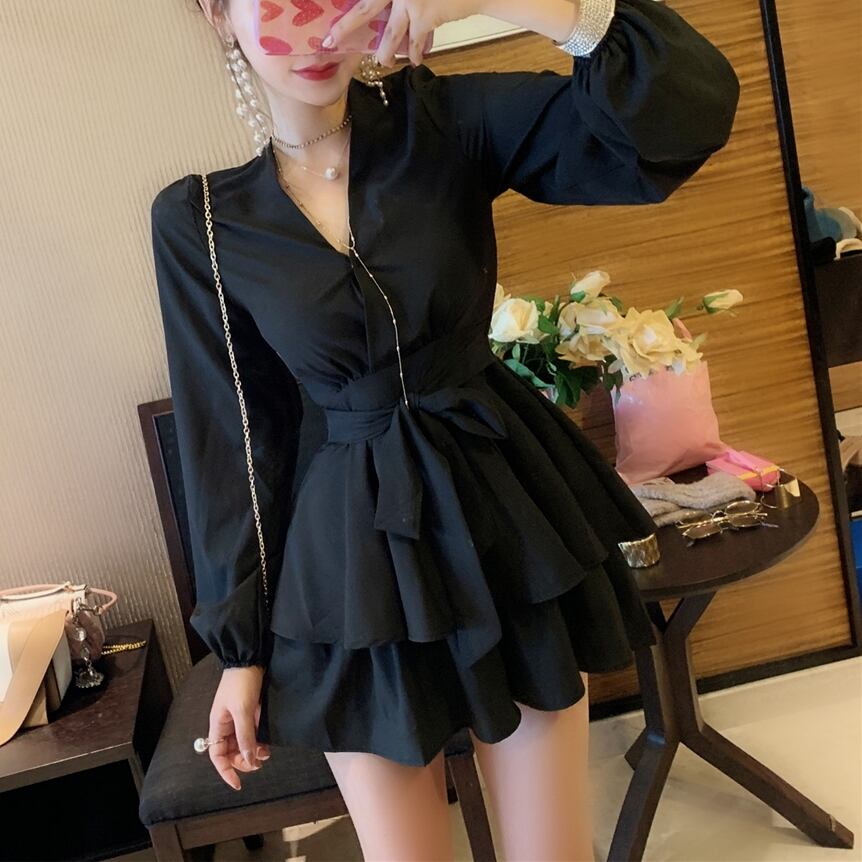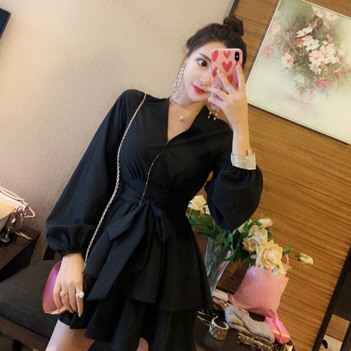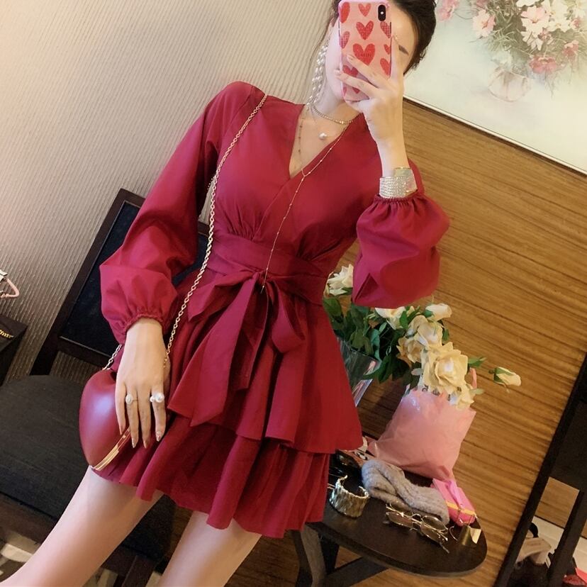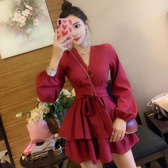 全2色 Vネック ワンピース ミニワンピ ティアード 段フリル 長袖 ロングスリーブ ハイウエスト リボン ランタンスリーブ 無地 シンプル 春 夏 秋