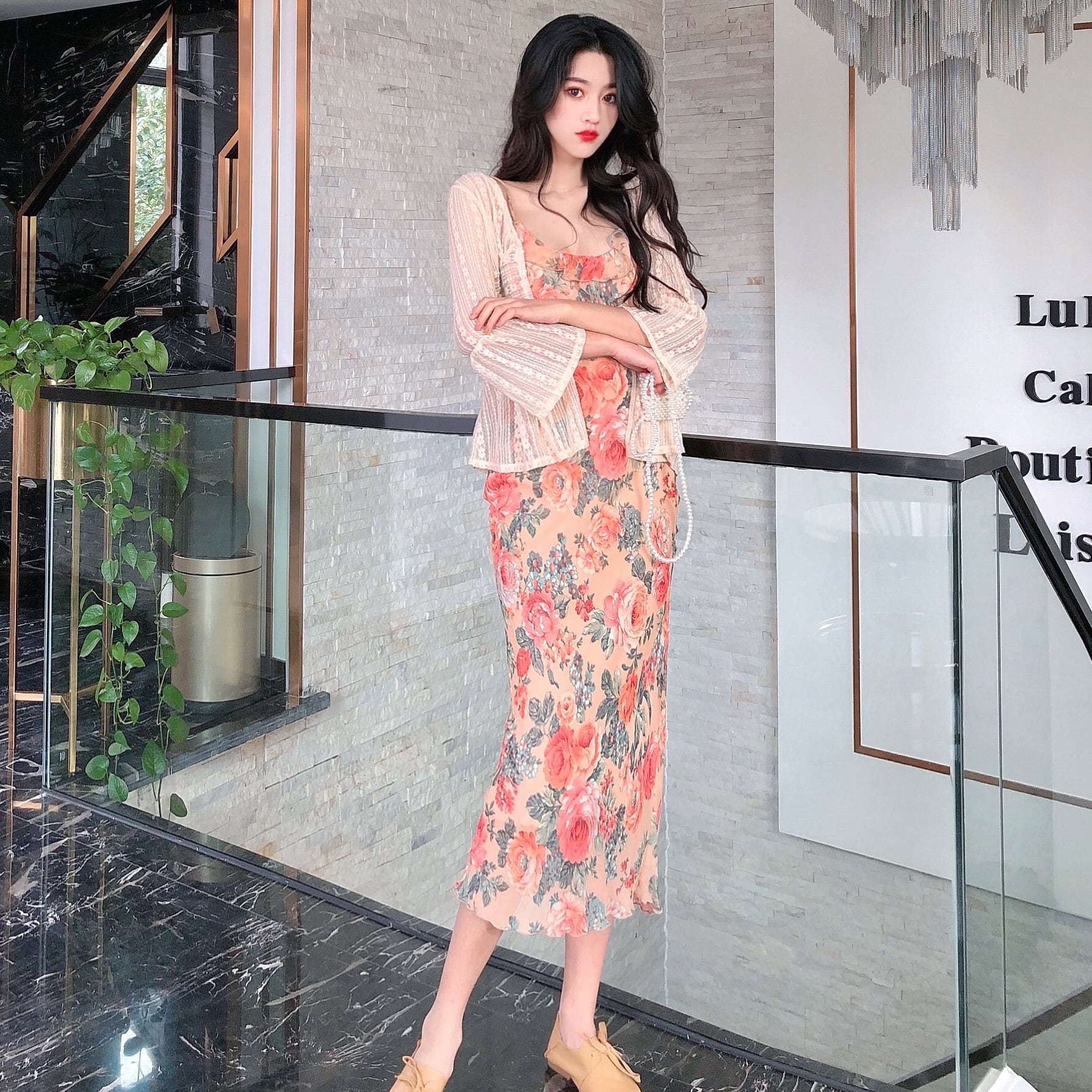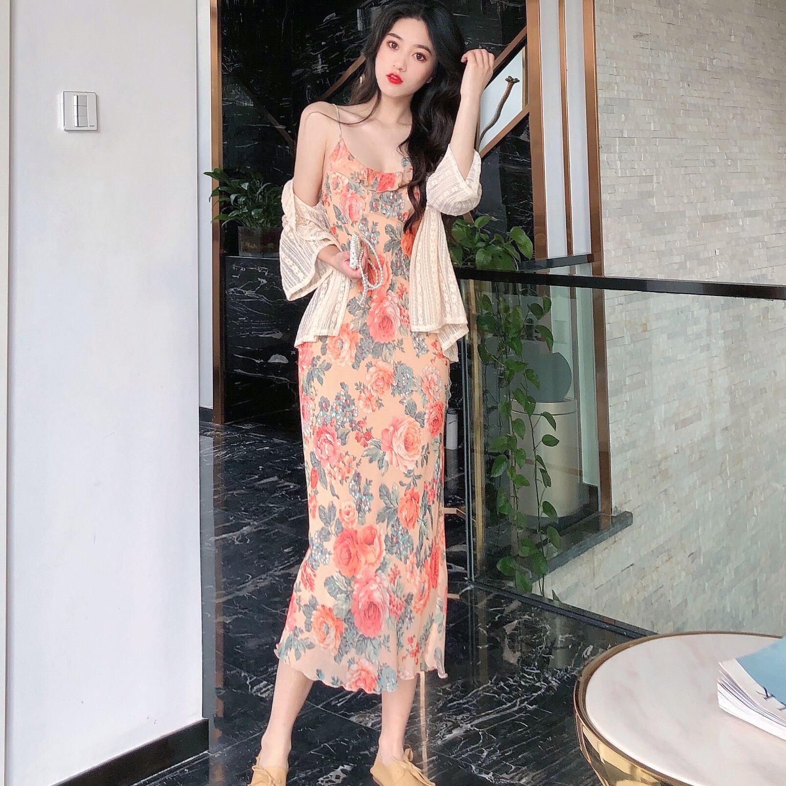 花柄 フローラル シフォン キャミワンピース ラウンドネック ハイウエスト Aライン ワンピ ミモレ丈 可愛い 大人可愛い レディース ガーリー フェミニン キュート お出かけ 旅行 リゾート 買い物 デート 女子会 夏