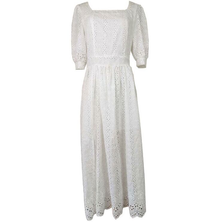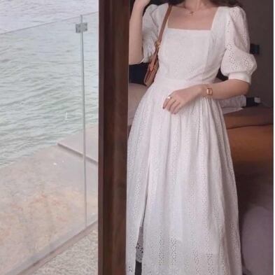フロントスカートにはスリットが入っていて、スクエアカラーが美デコルテを強調してくれます。