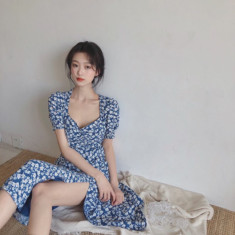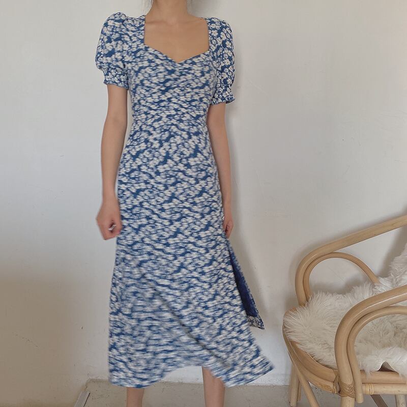 全2種 花柄 ワンピース ロング スリット 膝丈 Vネック ショート丈 半袖 パフスリーブ レトロ ブルー カワイイ 大人 おしゃれ 春 夏 大きいサイズ プラスサイズ